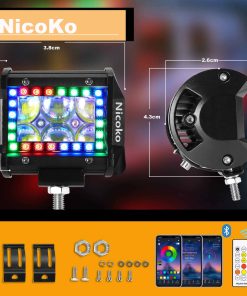 Pack 4 Miti-color 4″ 18w luz de trabajo LED con tira Halo RGB en persecución, el efecto de luz RGB y estroboscópico se controla tanto por control remoto como por APP en Android o iPhone, compatible con el efecto de luz RGB sync con ritmo musical en modo de música, compatible con el efecto de luz bricolaje. Puede iluminar tu camino oscuro, ampliar tu visión y ser perfecto para varios shows de camiones como carreras todoterreno, desfiles de flotas, fiestas en la playa y shows de música. Upgraded-Todas las luces de la nueva versión de Nicoko vienen con la función de código de emparejamiento para evitar que alguien controle tus luces cerca. Presiona el botón «auto» en un control remoto durante 3 segundo para sincronizar diferentes tipos de luces rgb de Nicoko. La aplicación Bluetooth y el control remoto no solo pueden controlar la luz blanca principal, sino también pueden controlar el Halo RGB en persecución. Ambas funciones se pueden cambiar suavemente. ¡No te preocupes por que el control remoto de mano se pierda en el futuro! Alta calidad 3w 6pcs Arc-leds premium con copas reflectoras profundas, emite una iluminación más brillante y a una mayor distancia de iluminación, ¡Ilumina claramente tu camino todoterreno! Brillo & Estroboscópico – Viene con un control remoto inalámbrico, puedes controlar libremente los halos de encendido/apagado, cambio de color, ajuste de brillo y velocidad y Modo de persecución en cualquier momento. Aplicación multicolor – Clasificación impermeable IP68 con lente de PC a prueba de polvo y a prueba de golpes, ideal para uso en interiores y exteriores, puede ser una luz auxiliar, lámpara de respaldo, luz de pub, foco de estudio, lámpara de jardín, luz decorativa de yate, etc. Fácil de instalar – ¡Solo conecta el conector al arnés de cableado! Funcionando a un rango de voltaje amplio de 10-30V DC, adecuado para la mayoría de 4×4, todoterrenos, camiones, SUV, ATV, UTV y barcos. La garantía es de 12 meses, soporte técnico de por vida y servicio al cliente amigable.