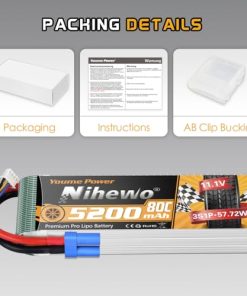 3. Especificación de las baterías Lipo – Material de la batería lipo Nihewo 11.1V: polímero de litio; Voltaje de la batería: 11.1V; Celda: 3S; Capacidad: 5200mAh; Configuración: 3S1P; Voltaje de celda: 3.2 ~ 4.2V; Tasa de descarga: 80C; Conector de carga: JST-XHR-4P; Conector de descarga: Conector EC5; Paquete: estuche suave; Calibre del cable: 10AWG.