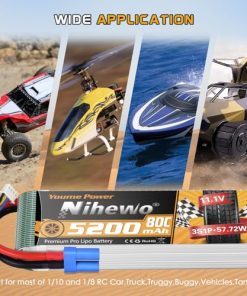 4. Potencia tu pasión – Las baterías lipo de RC Nihewo son compatibles con vehículos 1/8 de escala Crawler RC Car Truck Truggy y RC Avión Helicóptero UAV Drone FPV, tales como: Arrma, E-flite, Losi, Axial, HPI, Team Associated, Redcat Racing, etc. Conduce por más tiempo con la potencia de Nihewo. (Solo es aplicable cuando el voltaje, tamaño y conector coinciden. Y para el conector, puedes reemplazarlo tú mismo).