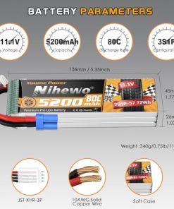 2. Dimensiones y peso de la batería 3S – Batería lipo Nihewo 3s ec5 5200mAh Dimensión (L A H): 136 45 26mm 3mm / 5.35 1.77 1.02 pulgadas; Peso aproximado: 340 g 15 g / 0.75 lb / 11.99 oz.