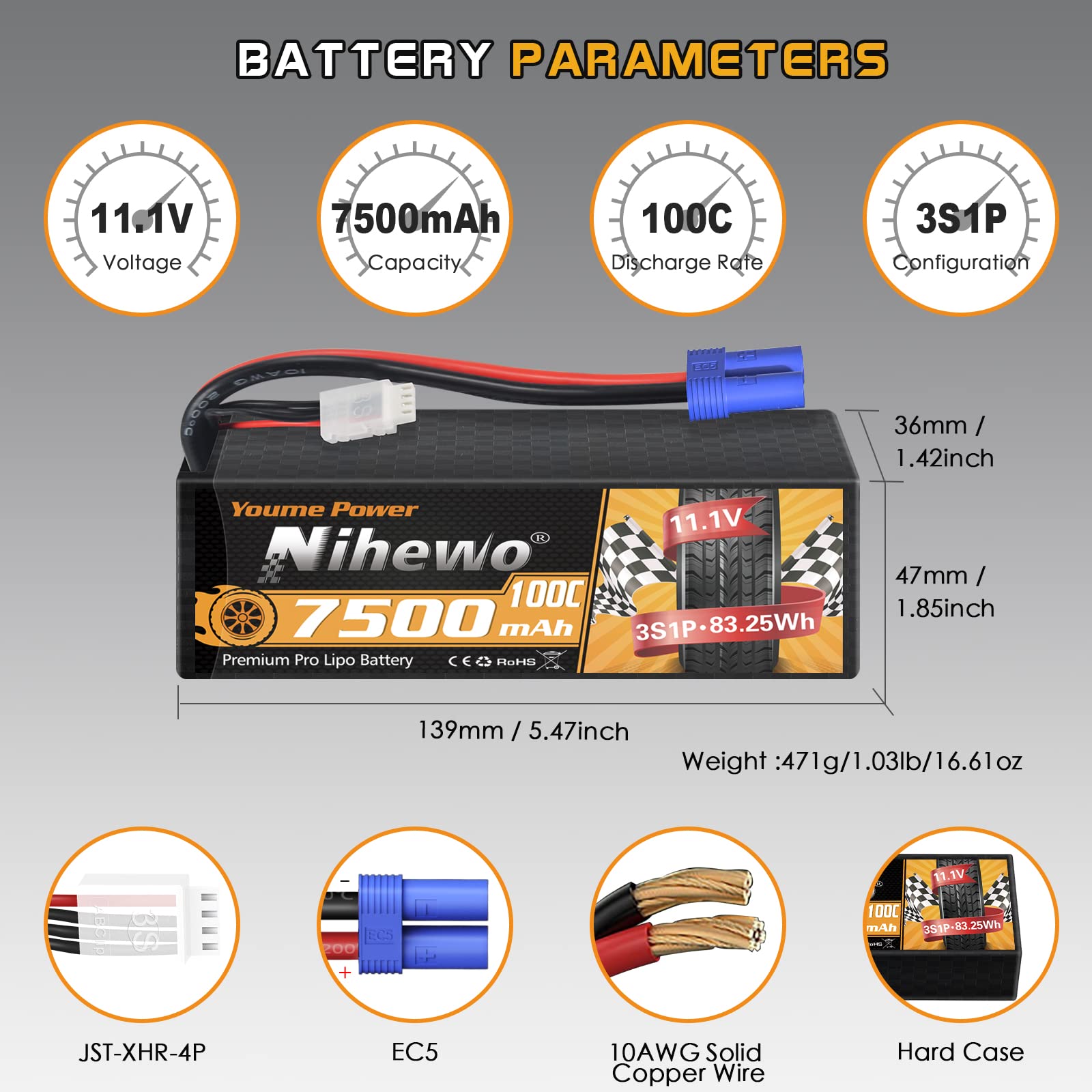 1. Especificación de la batería RC Lipo – Nihewo 11.1V Batería Lipo Material: polímero de litio; Voltaje de la batería: 11.1V; Celda: 3S; Capacidad: 7500mAh; Configuración: 3S1P; Voltaje de la celda: 3.2~4.2V; Tasa de descarga: 100C; Conector de carga: JST-XHR-4P; Conector de descarga: Conector EC5(Compatible con enchufe IC5); Estuche: Estuche rígido; Calibre del cable: 10AWG; Dimensiones(L A H): 139 47 36mm / 5.47 1.85 1.42 pulgadas; Peso aproximado: 471g / 1.03 libras / 16.61 onzas.