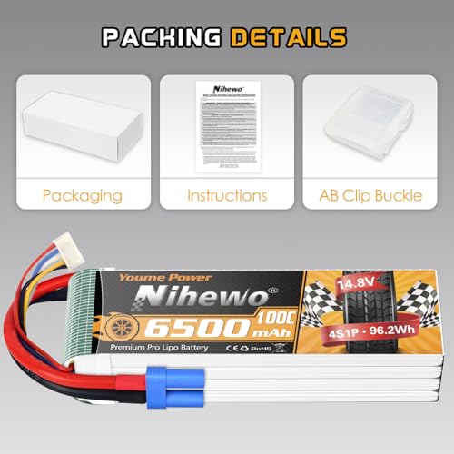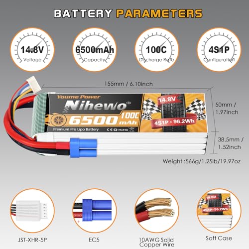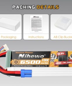 3. Especificación – Material de batería lipo Nihewo 14.8V: polímero de litio; Voltaje de la batería: 14.8V; Celda: 4S; Capacidad: 6500mAh; Configuración: 4S1P; Voltaje de celda: 3.2-4.2V; Tasa de descarga: 100C; Conector de carga: JST-XHR-4P; Conector de descarga: Conector EC5; Paquete: funda blanda; Calibre de cable: 10AWG.