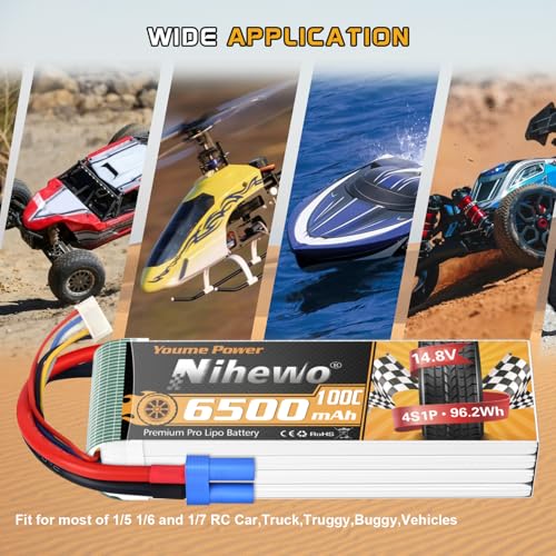 4. Potencia tu pasión – La batería lipo 4s de Nihewo es compatible con helicópteros RC, aviones, multirrotores, embarcaciones, coches/camiones a escala 1/5 1/6 1/7 como Arrma, E-flite, Losi, Axial, HPI, Team Associated, etc. (Solo es aplicable cuando el voltaje, tamaño y conector coinciden. Y para el conector, puedes reemplazarlo por ti mismo).