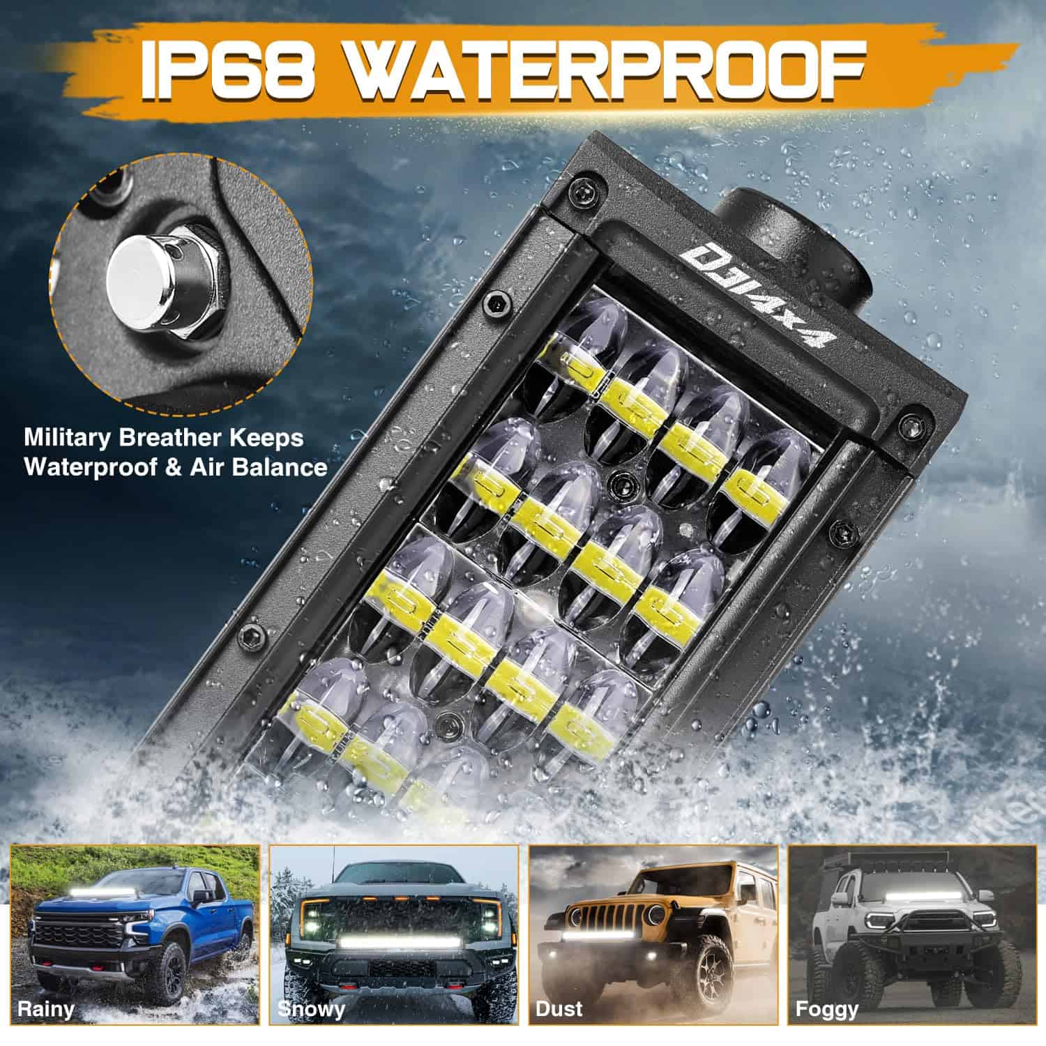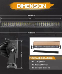 Especificación Potencia LED: 480W Lúmenes: 48,000 LM Voltaje de funcionamiento: 9 – 30V CC Clasificación impermeable: IP68 Temperatura de color LED: 6,000K a 6,500K Marca de chips LED: PHILIP Material de la carcasa: Aleación de aluminio de fundición 6063 Material de la lente: Policarbonato resistente (PC) Soportes de montaje: Soportes de acero inoxidable de aluminio Tipo de haz: Haz combinado de punto y aluvión Vida útil de trabajo: Más de 50,000 horas Por qué elegir Niking Auto 1. Súper brillante, el doble de chips LED que una barra de luces LED de doble fila normal. 2. La carcasa de aluminio de fundición con 12 radiadores proporciona un rendimiento excelente durante más de 50,000 horas. 3. Con impermeabilidad IP68, anticorrosión, a prueba de golpes, resistente al agua, puede usarse bajo la lluvia o en entornos adversos. 4. El soporte de montaje ajustable de acero inoxidable se puede ajustar de forma flexible para el ángulo de iluminación perfecto, lo que facilita el cambio de dirección del haz de luz. Aplicación 1. Vehículo todoterreno: Jeep, Wrangler, SUV, UTE, 4×4, 4WD, ATV, UTB, Golf, Toyota, Tacoma, Chevy, Nissan Titan, Silverado, Pathfinder, Hummer H2 H3, Yamaha Viking, Dodge Ram, Ford F150 F250 F350. 2. Usos en interiores como iluminación de jardines y patios e incluso iluminación de almacenes. 3. Vehículo especial (camión de bomberos, vehículo de rescate, vehículo de comunicaciones, vehículo de mando militar) montacargas, trenes, barcos, autobuses y tanques, etc. Paquete incluido: 1 x Barra de Luces LED de 30 pulgadas 4 Filas 1 x Cubierta de luz negra de una sola pieza 1 x Kits de montaje necesarios Garantía de 12 meses Una vez que hayas completado la instalación, disfruta de tu orgullo y alegría lo antes posible. ¡Diviértete y sé seguro!