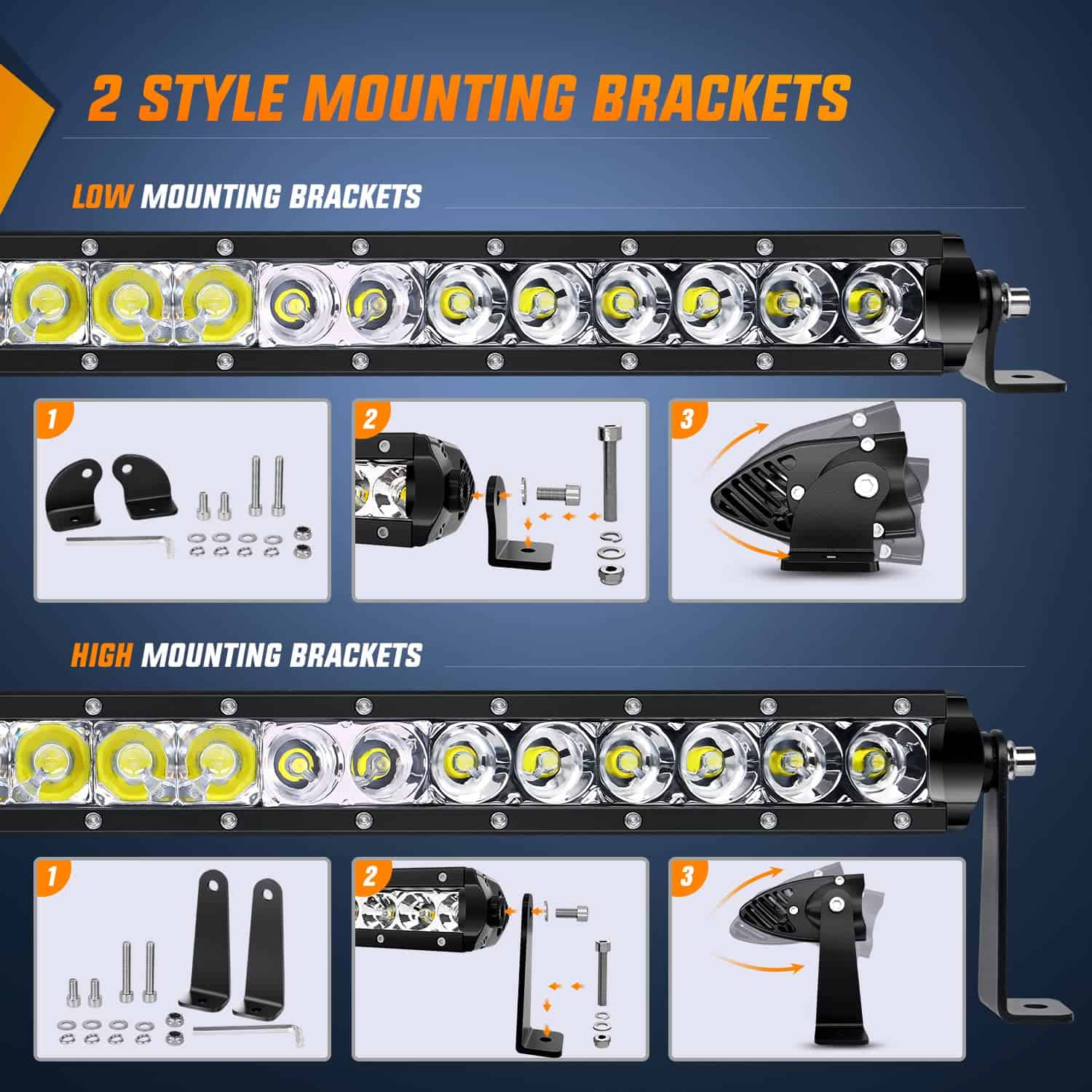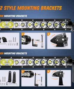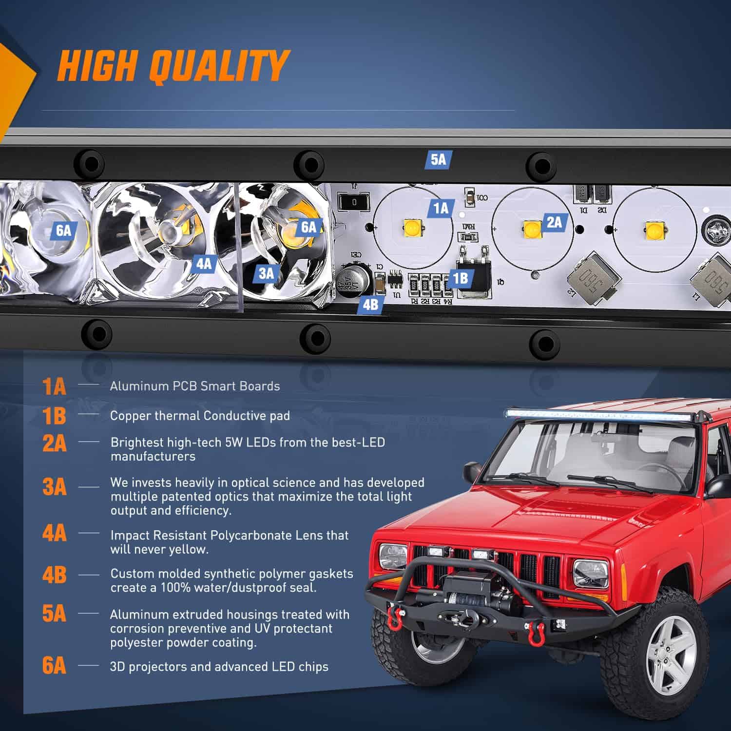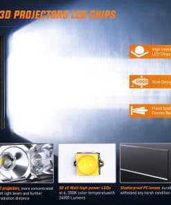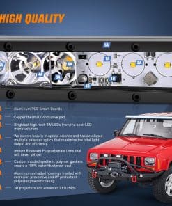 Potencia del LED: 250W (50 x 5W LED de alta intensidad) Patrón de haz: Combo de Punto y Aluvión Voltaje de entrada: 9-30V DC (compatible con vehículos de 12V, 24V) Vida útil de trabajo: Más de 30,000 horas Temperatura de trabajo: -40~85 grados Celsius Temperatura de color del LED: Blanco puro 6000K-6500K Material: Perfil de aleación de aluminio 6063, Chips LED de alta calidad, Lente de PC Tasa impermeable: IP67, a prueba de agua, a prueba de polvo, a prueba de terremotos y anticorrosivo. Certificaciones: CE, FCC y RoHS Aplicaciones: Iluminación para Vehículos Todo Terreno: Jeeps, 4×4, ATV, UTV, SUV, Camiones, Coches, Pick-up, Furgoneta, Autocaravana, Buggy de Carretera, Duna, Trenes, Autobuses, Tanques, etc. Iluminación para Barcos: Barco, Yate, Lancha, Carguero, Barco, etc. Iluminación de Equipos: Es adecuada para Remolque, Montacargas, Excavadora, Topadora, Rodillo de Camino, Grua, Tractor, Cosechadora, Taladro de Grano, Pala de Nieve, Camión de Bomberos, Vehículo de Rescate, Camping, Minería, Construcción y otras iluminaciones exteriores. Iluminación Doméstica: Jardín, Patio Trasero, Garaje, Iluminación Interior. (Nota: Utilice un transformador/conversor de voltaje para convertir el AC 110-120V a DC 12V para uso en interiores.) Nota: Son piezas de repuesto. NO aprobadas por D. O. T. No usar si se requiere D. O. T. Solo para uso fuera de carretera. Antes de instalar este producto, por favor revise las leyes y regulaciones estatales/provinciales y locales/municipales.