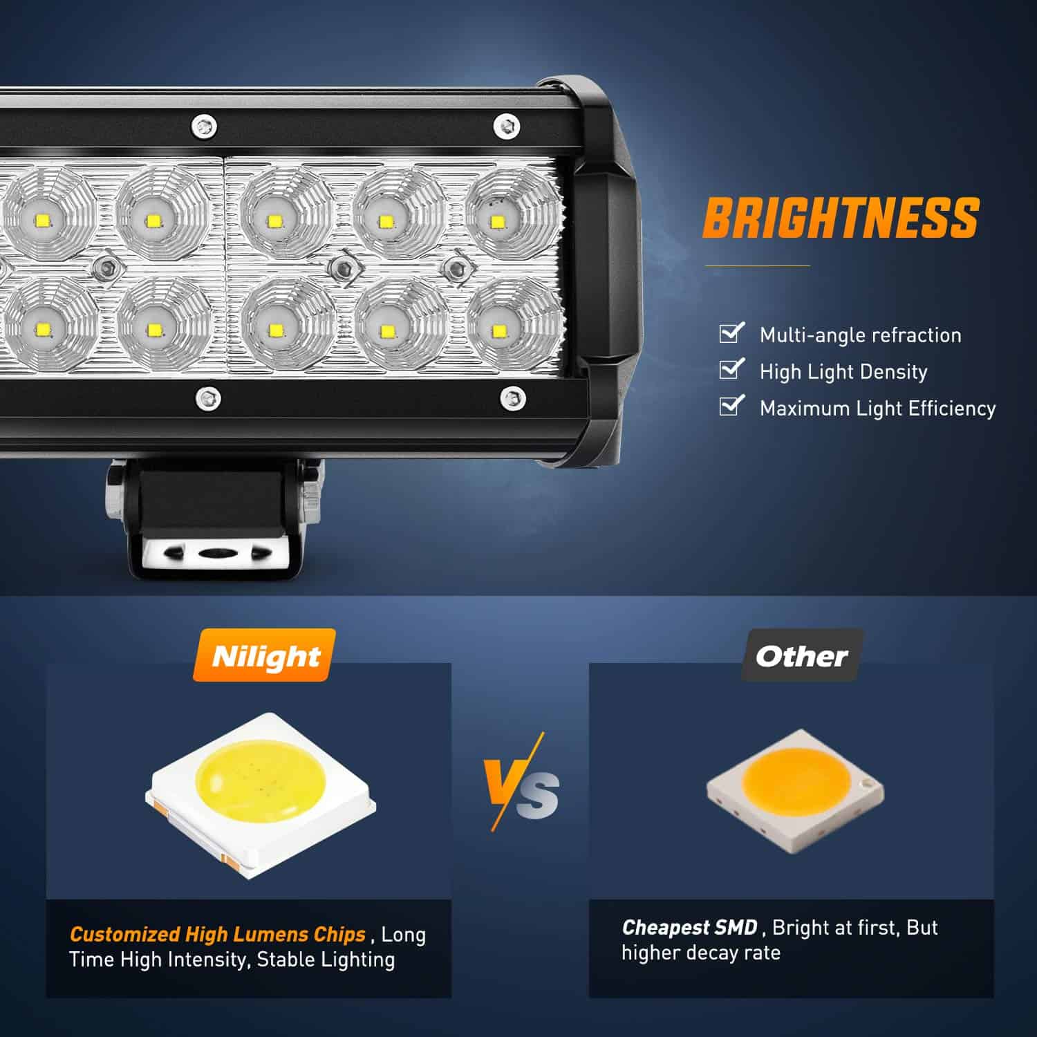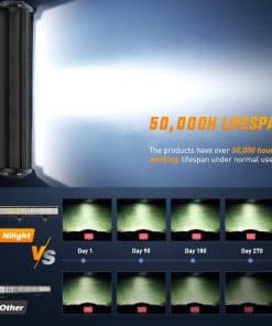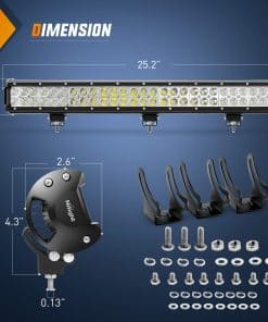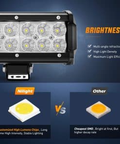 Especificaciones: Potencia LED: 162W (54 x 3W Alto Intensidad LED) Patrón de Haz: Combinación de Inundación y Punto Voltaje de Entrada: 9-30V DC (compatible con vehículos de 12V, 24V) Vida Útil de Trabajo: Más de 30,000 horas Temperatura de Trabajo: -40~85 grados Celsius Temperatura de Color LED: Blanco Puro 6000K-6500K Material: Perfil de Aleación de Aluminio 6063, Chips Led de alta calidad, Lente de PC Índice de impermeabilidad: IP67; Impermeable, a prueba de polvo, resistente a los terremotos y anticorrosivo. Aplicaciones: Iluminación Fuera de Carretera: Jeep, 4×4, Coche, ATV, UTV, SUV, Camión, Remolque, Montacargas, Tren, Barco, Autobús, Iluminación exterior, etc. Otra Iluminación: Excavadora, Buldócer, Rodillo de Camino, Grúa, Tractor, Cosechadora, Taladro de Grano, Quitanieves, Camión de Bomberos, Vehículo de Rescate, Iluminación Minera, Iluminación de Construcción, etc. Iluminación Doméstica: Jardín, Patio Trasero, Garaje, Iluminación Interior. (Nota: Use un transformador/conversor de voltaje para convertir el AC 110-120V a DC 12V para uso en interiores.) Nota: Son piezas de posventa. NO están aprobadas por el D.O.T. No use si se requiere el D.O.T. Solo para uso fuera de carretera. Antes de instalar este producto, por favor revise las leyes y regulaciones estatales/provinciales y locales/municipales.