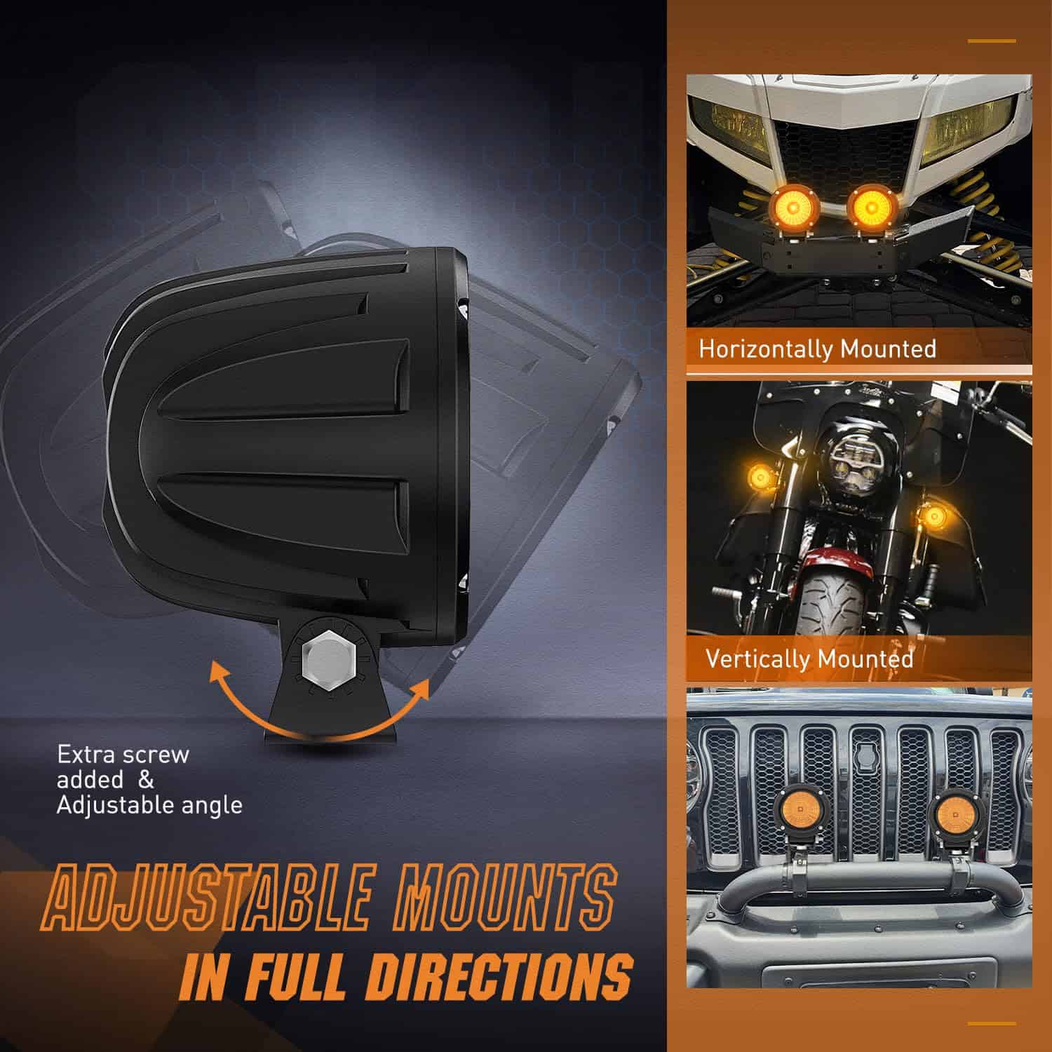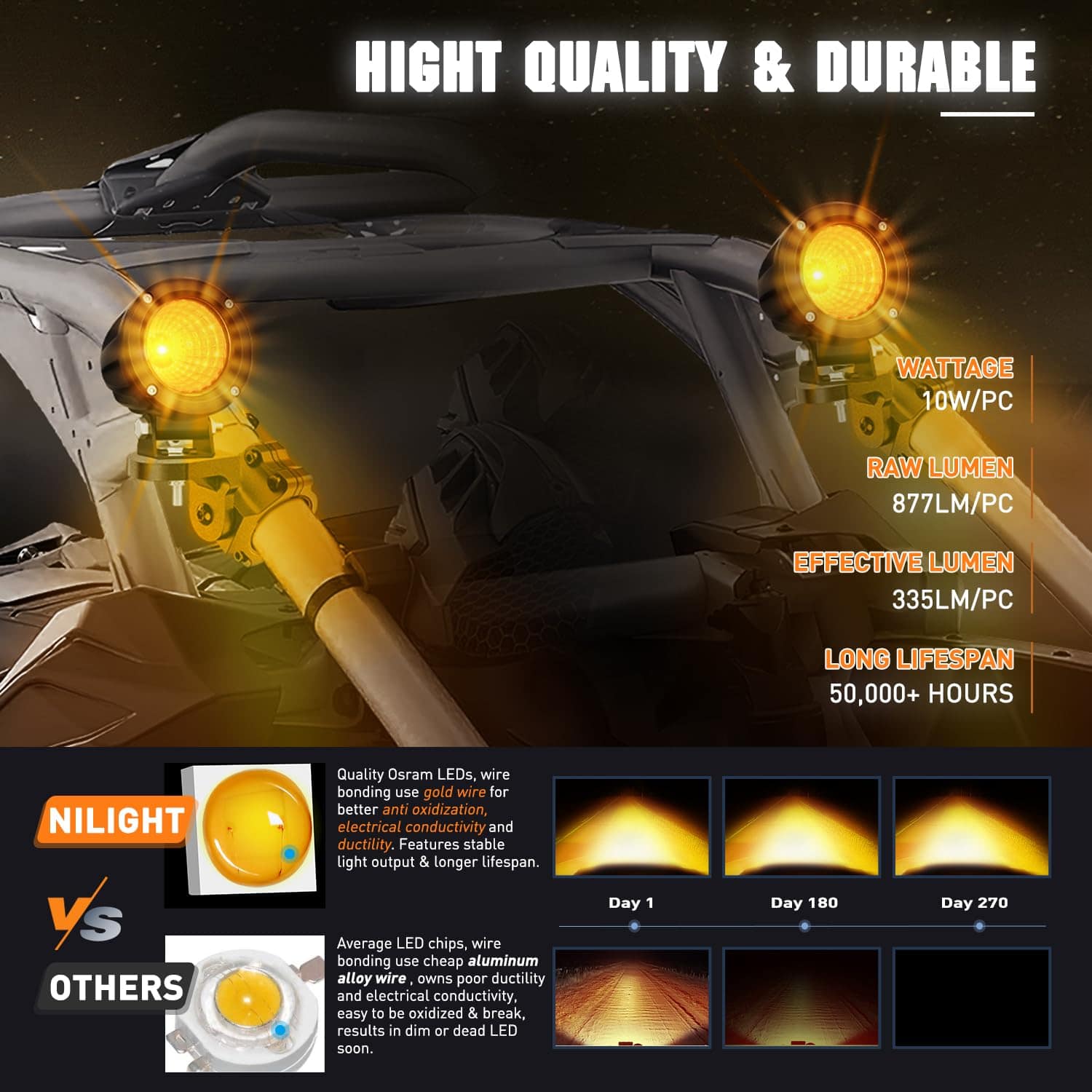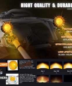 1. BRIGHT AMBER FOG LIGHTS: Emplea chips led Osram de alta calidad, lente amarilla óptica especialmente diseñada y copa refractiva, logra un súper haz de luz de alta intensidad de inundación 60, brindándole una conducción más clara y segura en clima neblinoso, con nieve, lluvia, evitando que la niebla/nieve/polvo refleje la luz de vuelta en los ojos del conductor. 2. High Quality: Incorpora impermeable IP68, potente para resistir cualquier entorno y condiciones climáticas adversas. También las luces incorporan EMC para protección contra EMI/RFI, resolviendo el problema de interferencia y parpadeo de radio. 3. Construido para Durar: Emplea chips led Osram de alta calidad que presenta un mayor lumen y alambres dorados de calidad construidos, brindando una salida estable de 1080LM a cada luz para iluminar todo el camino por delante. Le proporciona menos decaimiento de la luz o led muertos, sino una larga vida útil de 50,000+ horas. 4. Montable en Todas las Direcciones: Las luces led offroad redondas vienen con soportes de montaje ajustables, se pueden montar libremente de forma horizontal o vertical sin cambiar el efecto de iluminación. 5. Amplia Aplicación: Luces de pod de 3 pulgadas, perfectas para luces auxiliares de motocicletas, luces de conducción led redondas para faros led offroad para tractor, reemplazo de las luces antiniebla de fábrica de parachoques, bicicleta de montaña, SUV, ATV, camión, Jeep, barco, tractor, montacargas, etc. , 5 Años de Garantía Honrados por Nilight