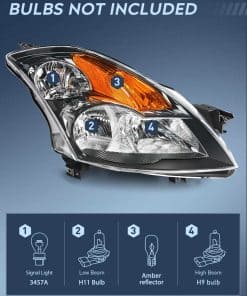 1. Compatibilidad: Los conjuntos de faros delanteros son compatibles con el Altima Sedán 4 puertas 2007 2008 2009. No son compatibles con modelos HID de fábrica. Tipo de bombilla de luz alta / baja: H9 / H11 (las bombillas no están incluidas), Luz de giro: 3457NA (las bombillas no están incluidas), use Bombillas de Stock para la instalación.