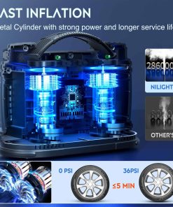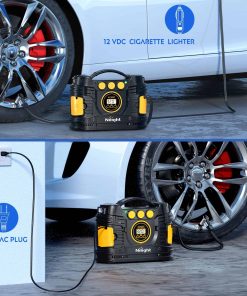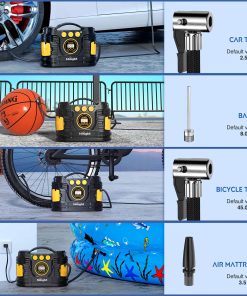 1. Inflador de doble potencia: Esta bomba de inflado de doble potencia puede funcionar a través de AC/DC, se puede utilizar en coches de 12V y enchufes domiciliarios de 110V. Este inflador de aire portátil tiene un chip de alto rendimiento integrado que infla rápidamente los neumáticos y proporciona 22 L/min de flujo de aire. La especificación del cilindro de esta bomba es de 22 mm, lo que solo tarda menos de 2 minutos en inflar los neumáticos de coches SUV.