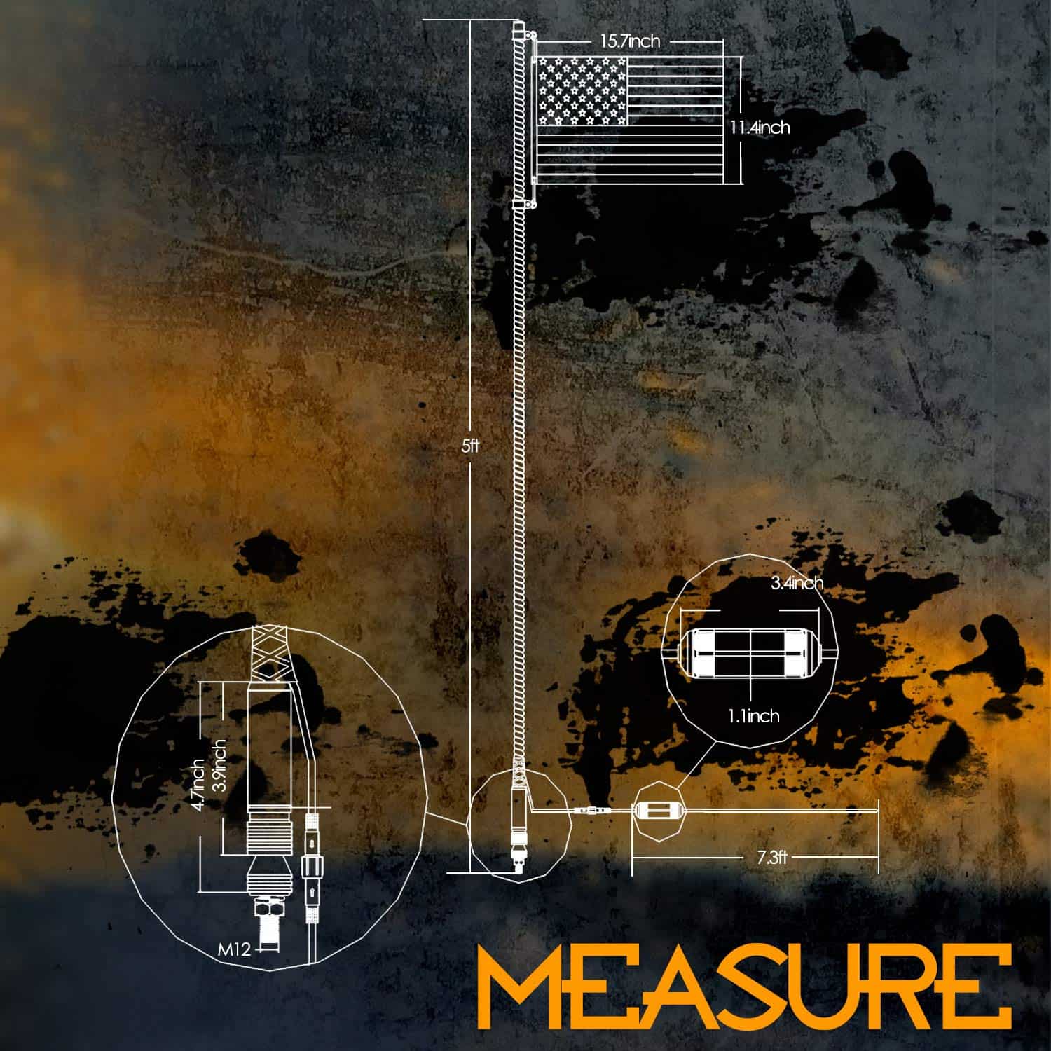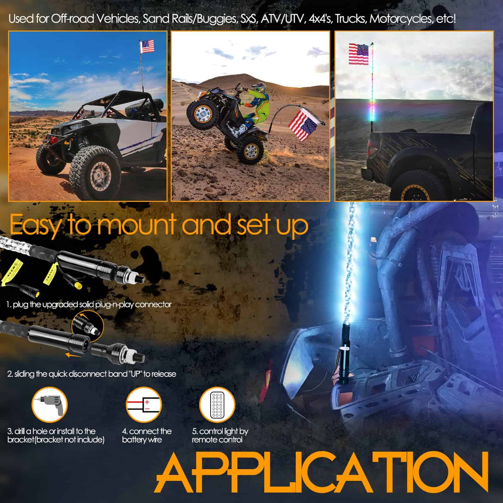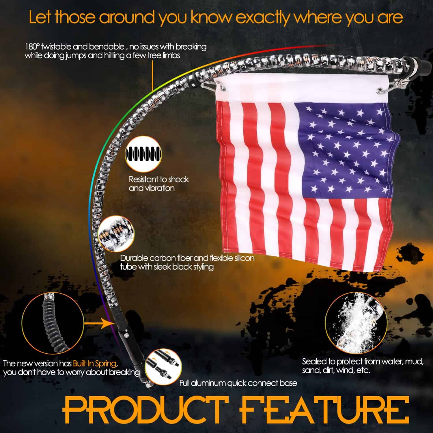 IP67 Resistente al agua / al polvo. 180 grados flexible y retorcible, sin problemas de rotura al hacer saltos y golpear algunas ramas. Las tiras LED negras están unidas por termorretracción y tubo de silicona para evitar la delaminación y la vibración. La bandera de nylon se ha probado a 100 mph sin deshilacharse. Con protección contra sobrecargas. 50,000+ horas de vida útil. Plug-and-play, fácil de instalar. Solo desliza la base de desconexión rápida para liberar, instala la base en el coche, luego conecta los cables de alimentación, por último, controla la luz con el mando a distancia. La luz de seguridad universal LED whip se puede instalar en cualquier ubicación que consideres adecuada para que sin importar el fabricante y el modelo que conduces, seguramente encontrarás la posición perfecta para ella. Se puede utilizar como luz de persecución, luz de señal, luz decorativa, luz de advertencia, para que quienes te rodean sepan exactamente dónde estás. Perfecto para SXS, ATV, UTV, Cuatriciclo, Can-Am, Polaris, RZR, Carro de Golf, Buggy de Dunas, Sand Rail, Camión, Pickup, Go Kart, Motocicleta, Equipo Industrial y todo lo que exista entre medias. Caja que vienen con: 5 pies whip iluminado con arnés de 7.3 pies y caja de control, base de montaje de conexión / desconexión rápida, mando a distancia, bandera americana con ganchos de liberación rápida y ojales ajustables, hardware, tapa whip negra para resistente al polvo, manual. Proporcionar 12 MESES de garantía de calidad. Responde rápidamente en 24 horas.