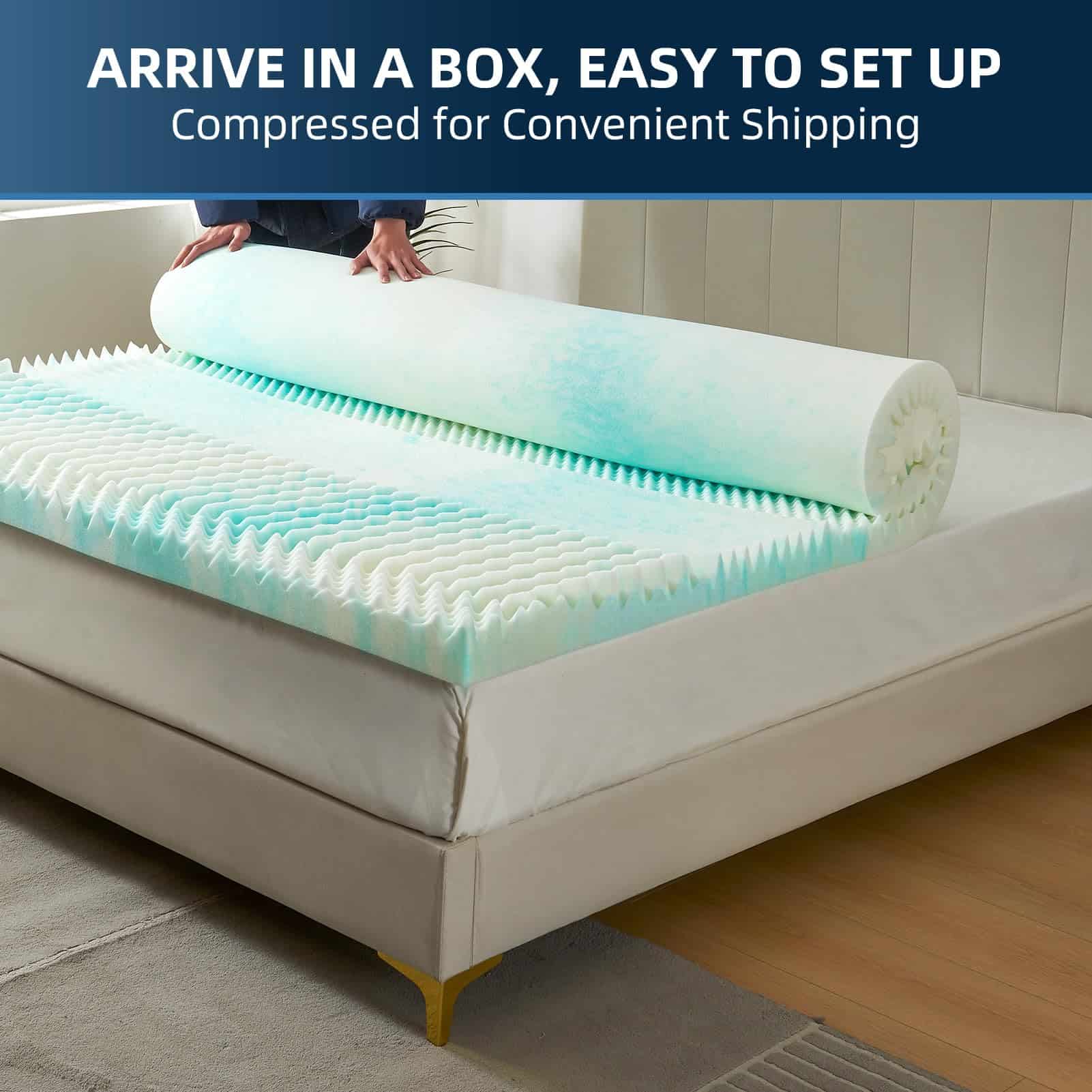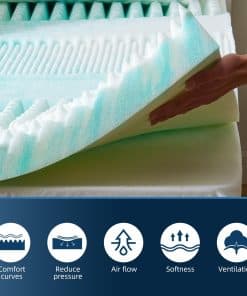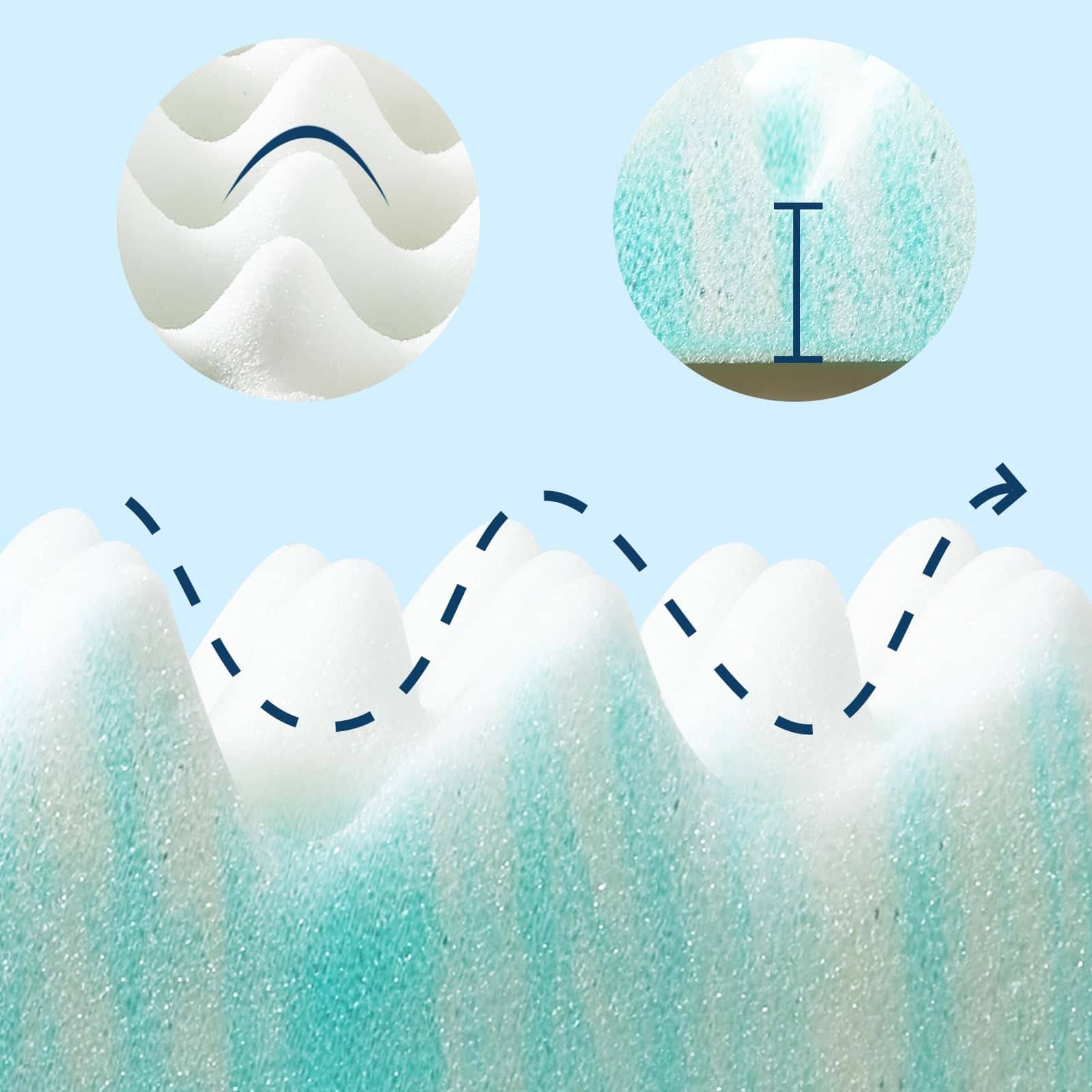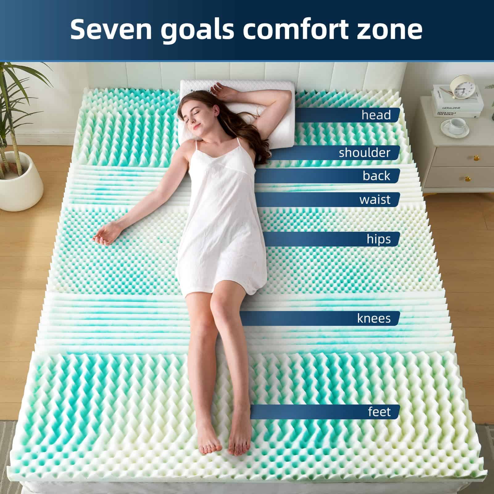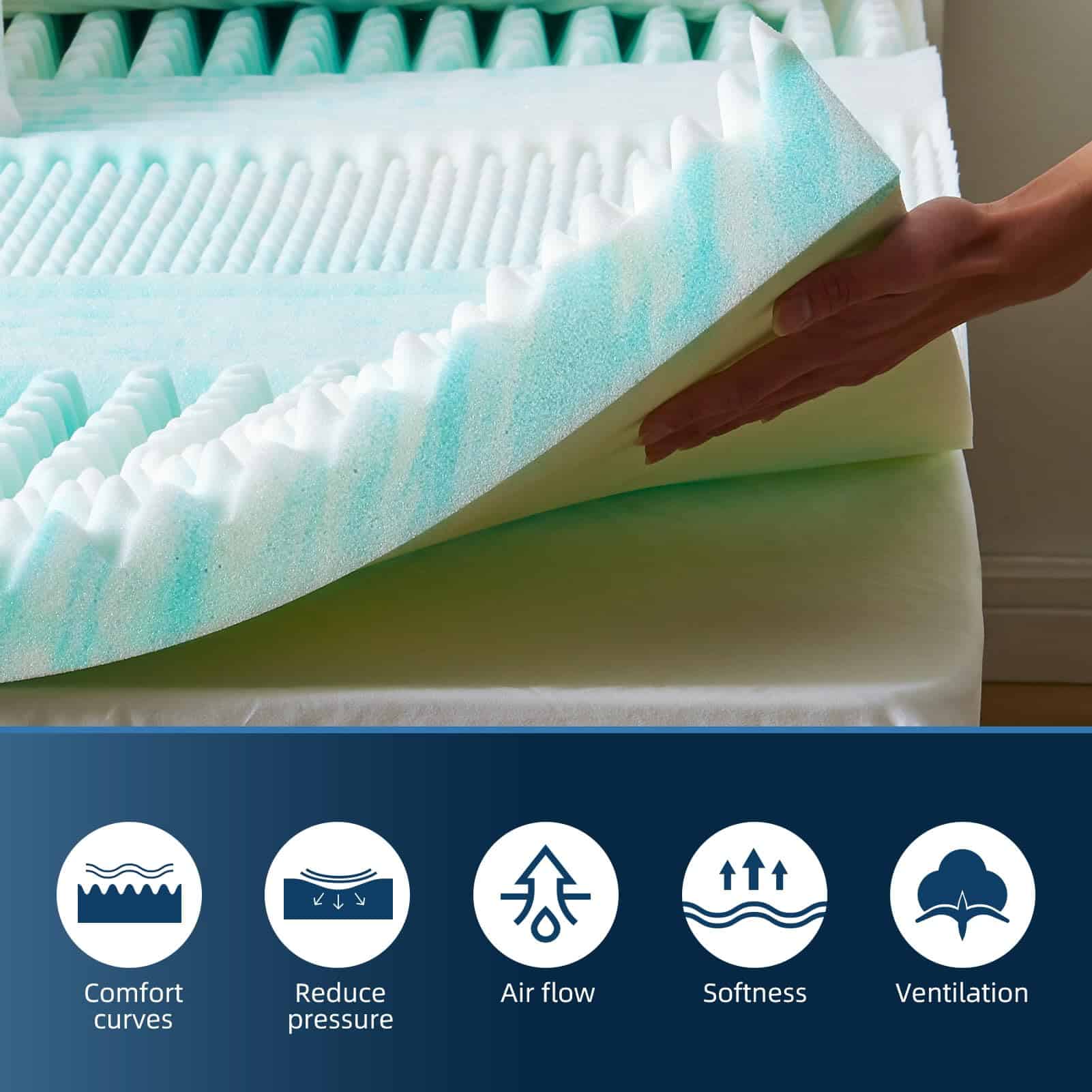 1. Espuma de Memoria de Gel. 2. DISEÑO DE ENFRIAMIENTO Y FLUJO DE AIRE: Las subidas y bajadas y los intermedios de este colchón especial diseñado con gel de enfriamiento promueven el flujo de aire en toda la capa de espuma viscoelástica, ayudando a regular la temperatura y disipar el calor, el colchón transpirable te mantiene refrescado. Muy transpirable y cómodo. 3. Diseño de 7 Zonas: Las 7 zonas especiales proporcionan soporte y comodidad específicos. Ofrece máxima comodidad en 7 zonas del cuerpo. Múltiples puntos de contacto para suavizar la presión corporal. Ambos lados se pueden usar – si prefieres el topper tradicional, puedes usarlo al revés. 4. La espuma de memoria certificada por CertiPUR-US asegura el rendimiento del topper. 3 pulgadas de suave espuma de memoria sensible es una forma fácil de ayudar a ablandar un colchón firme. Haz que tu viejo colchón se sienta nuevo. Fácil de instalar encima del colchón y usar. 5. Empaquetado Limpio: El Colchón NOFFA se comprime profesionalmente en una caja de embalaje para facilitar la recepción. Vuelve a su forma original en un plazo de 72 horas después de sacar el topper. Cuando la temperatura es alta, la espuma de memoria se expande más rápido, y cuando la temperatura es baja, el tiempo de expansión se vuelve más largo.