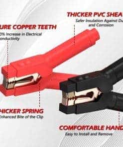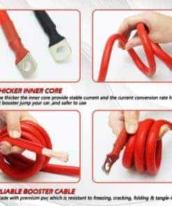1. 30 pies de longitud con enchufe rápido de 5 pies que se conecta a la batería del camión para una conexión rápida y eficiente de los cables de refuerzo. 2. Calibre 00 pesado 30 pies, soporta 1000A de corriente máxima para arrancar una batería muerta o descargada.