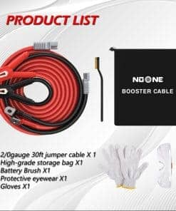 Cable de refuerzo NOONE calibre 00 de 30 pies de longitud que soporta 1000A de corriente pico para arrancar una batería muerta o descargada. Adecuado para una amplia gama de vehículos con motores de gasolina de 9.0 litros y diésel de 6.5 litros. Los cables de refuerzo NOONE son resistentes a los enredos y han pasado rigurosas pruebas de temperatura de trabajo para cumplir y superar los estándares UL 1839. Clips metálicos resistentes con lámina interna de cobre puro y diseño patentado con recubrimiento de goma no conductiva para un uso seguro y duradero. Además de los cables de refuerzo calibre 00 de 30 pies, incluye bolsa de transporte, guantes, accesorios de tornillo y cepillo. Kit de cables de refuerzo NOONE para coche con servicio de productos de 3 años.