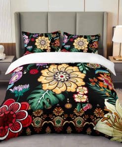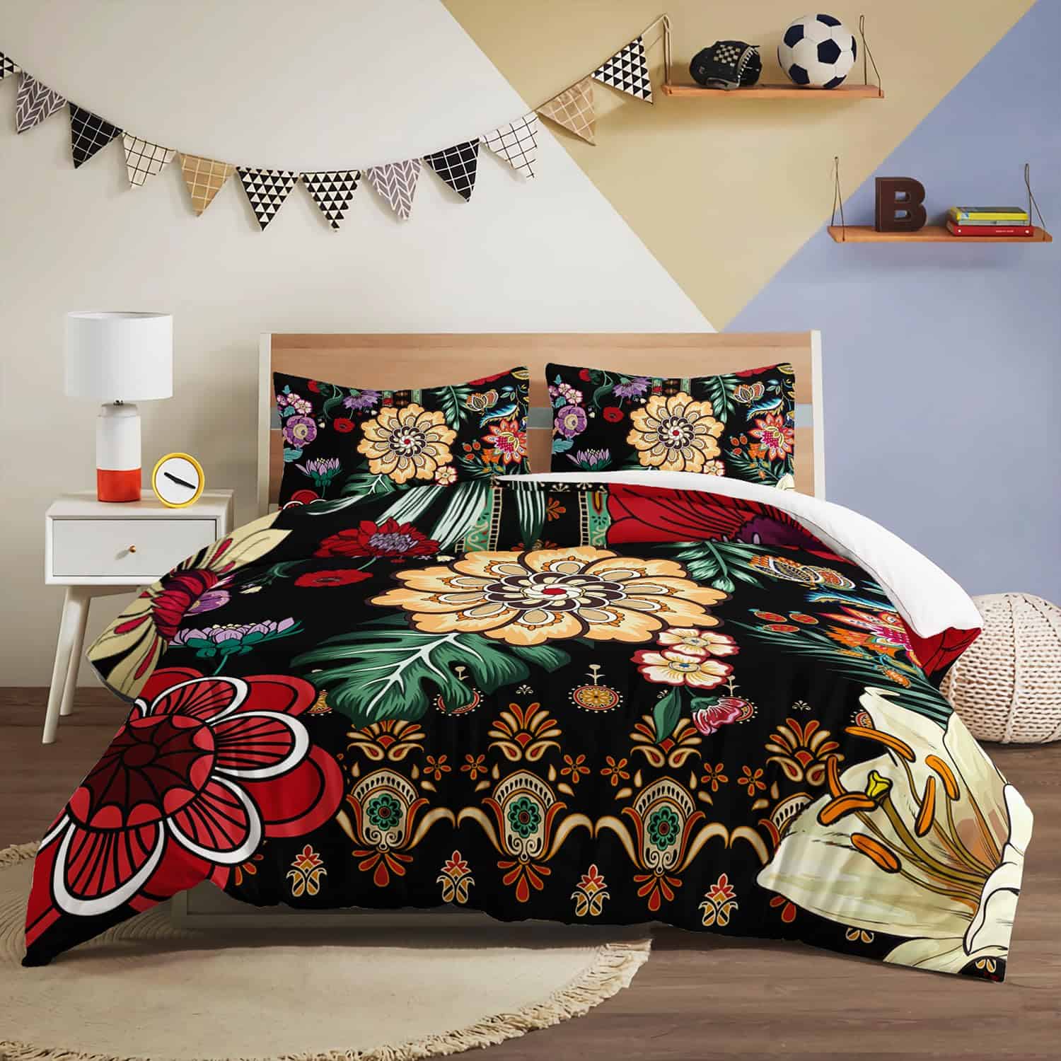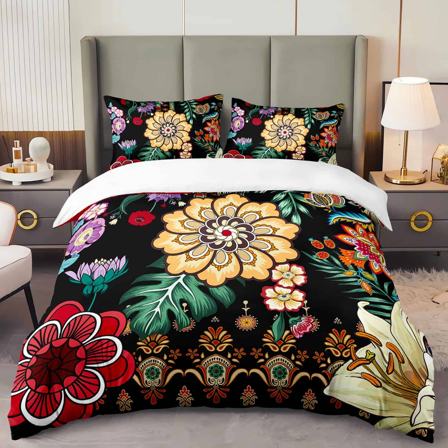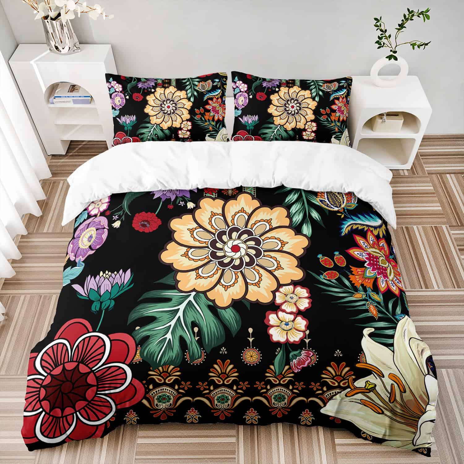 Juego de Funda de Edredón King Size Boho Chic Negro de Flor con Cierre de Cremallera, Juego de Funda de Edredón de Flor Botánica Queen de Microfibra de 3 Piezas para Niños