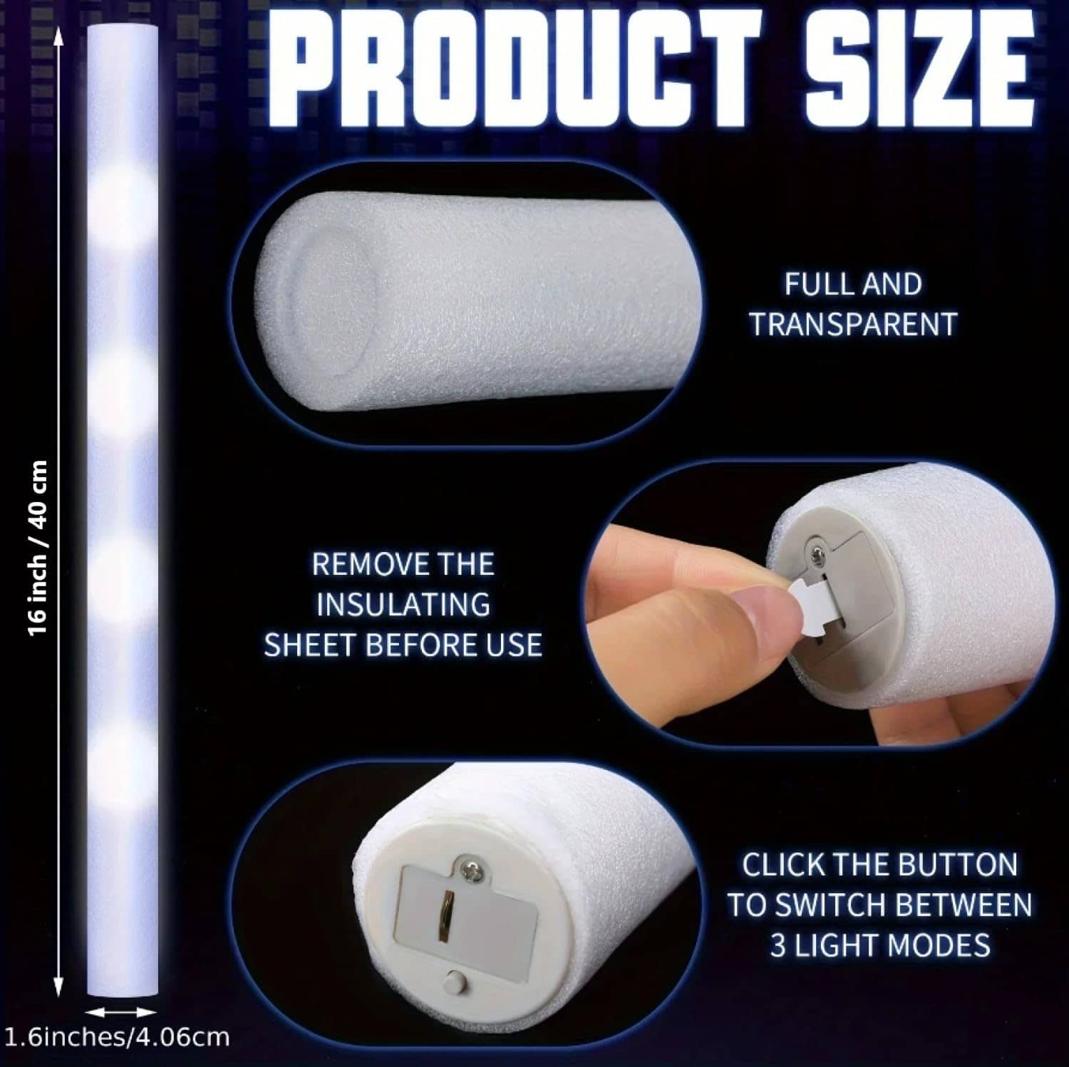 Nuestros palos de resplandor de espuma están hechos de espuma suave y plástico de alta calidad. No tóxicos, más divertidos y seguros. Resplandor que dura 8-12 horas. Disfruta de tu fiesta toda la noche sin preocuparte de que se desvanezcan