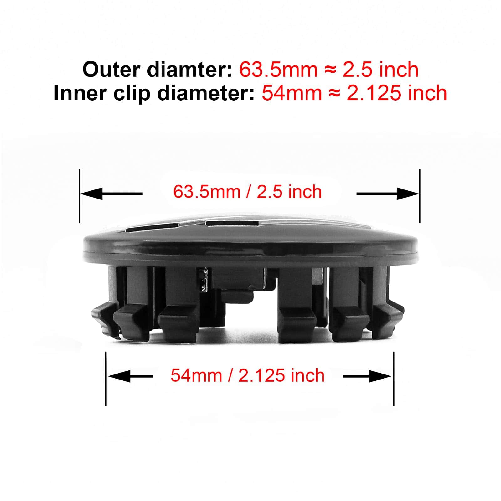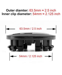 Tamaño: diámetro exterior es 63.5mm, aproximadamente 2.5″, diámetro de los clips internos es 54mm, aproximadamente 2.125″, por favor compare con su tapacubos de rueda original o mida el diámetro del agujero de su centro de rueda