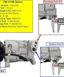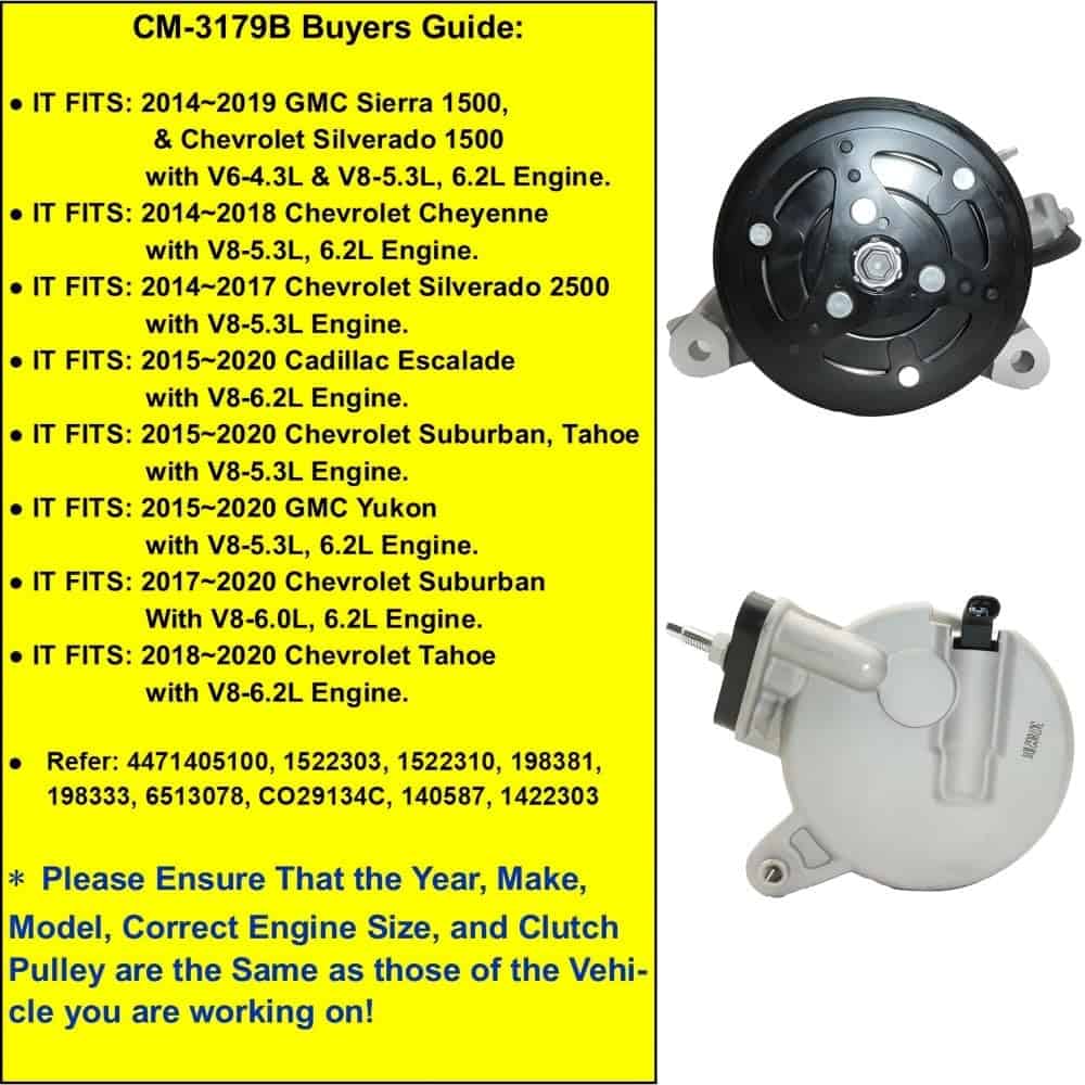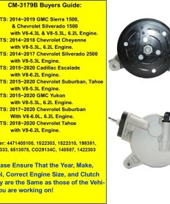 Este nuevo compresor de A/C automático CM-3179B es una opción confiable y de alto rendimiento como reemplazo para ciertos vehículos GM de 2014 a 2020. Diseñado para adaptarse a los modelos 1500 de Sierra, Yukon, Silverado, Suburban y Tahoe de GM con motores V6-4.3L, V8-5.3L o V8-6.2L, así como Silverado 2500 del 2014 al 2017 con V8-5.3L y Escalade del 2015 al 2020 con V8-6.2L.