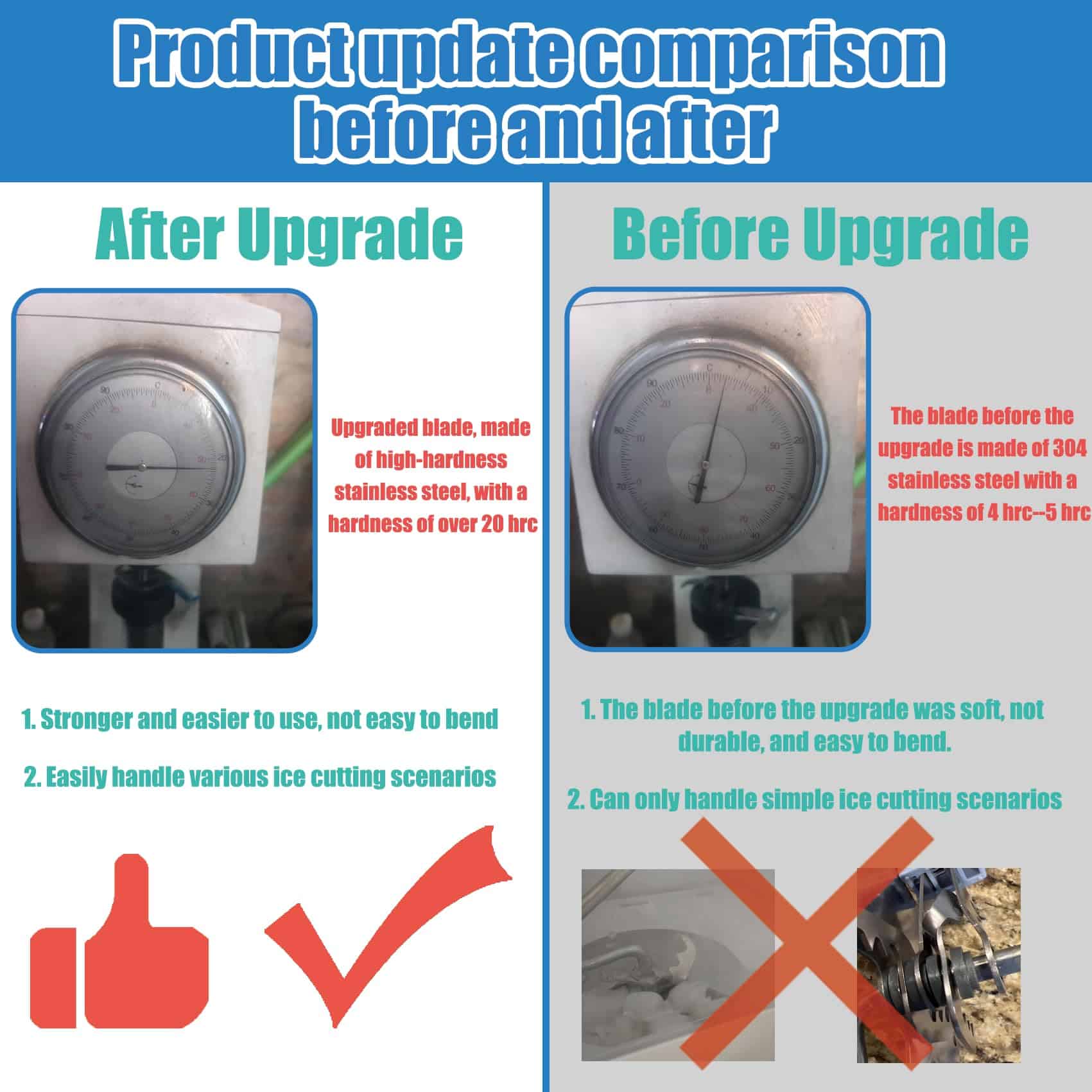 1. Contenido de actualización del producto: Nuestro cubo de hielo W10347093, WPW10347093 ha sido actualizado de acero inoxidable 304 a un material de acero inoxidable de mayor dureza, y la dureza se ha aumentado de 4 HRC a 5 HRC al actual más de 20 HRC, por lo que puedes usarlo con confianza.