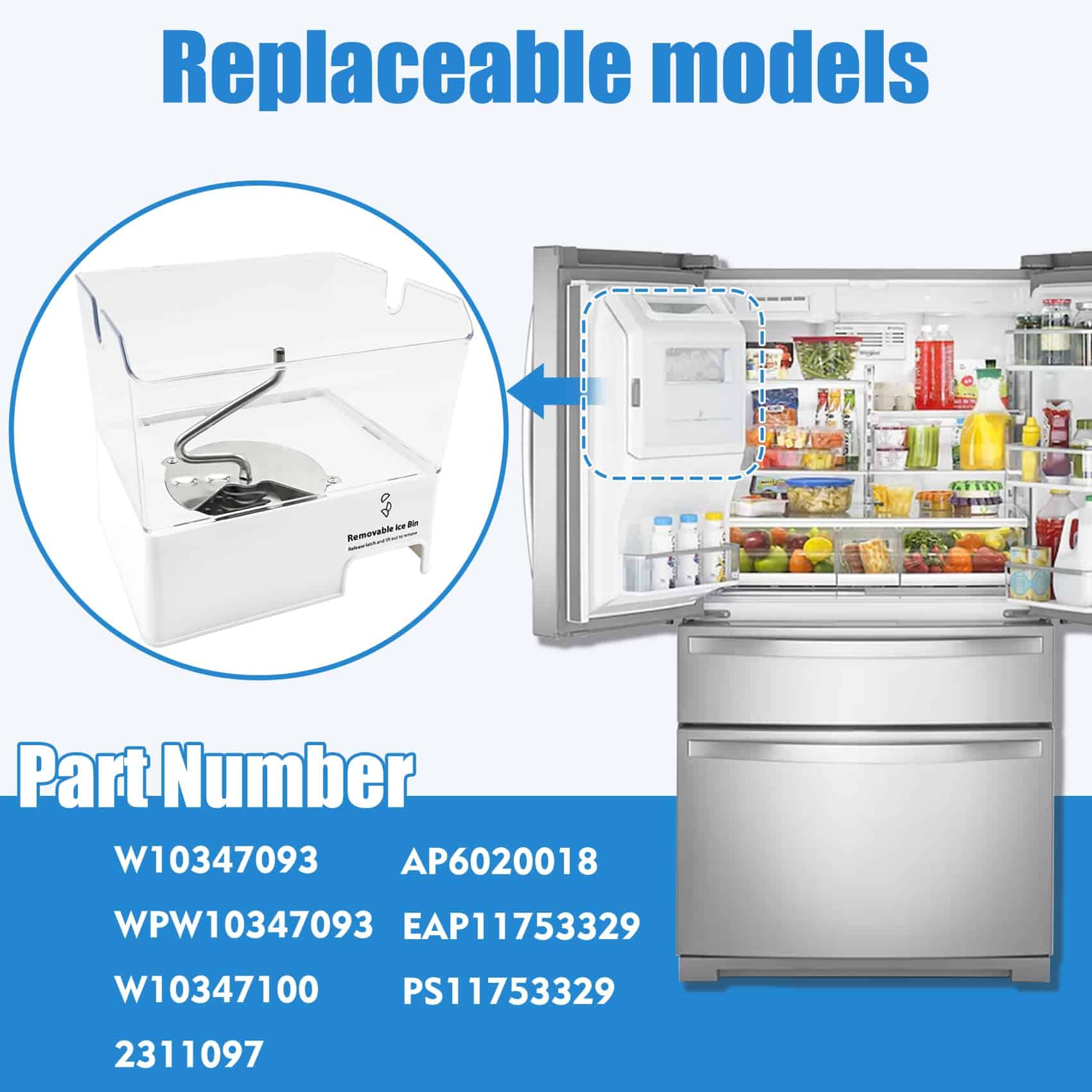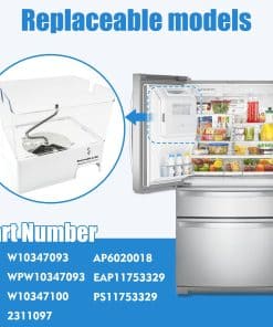 3. Modelo de reemplazo: Ensamble del cubo de hielo de refrigerador actualizado W10347093/WPW10347093 para el reemplazo del fabricante de hielo whirlpool. Modelos reemplazables de cubo de hielo W10347093/WPW10347093: W10347100, 2311097, AP6020018, EAP11753329, PS11753329, etc.