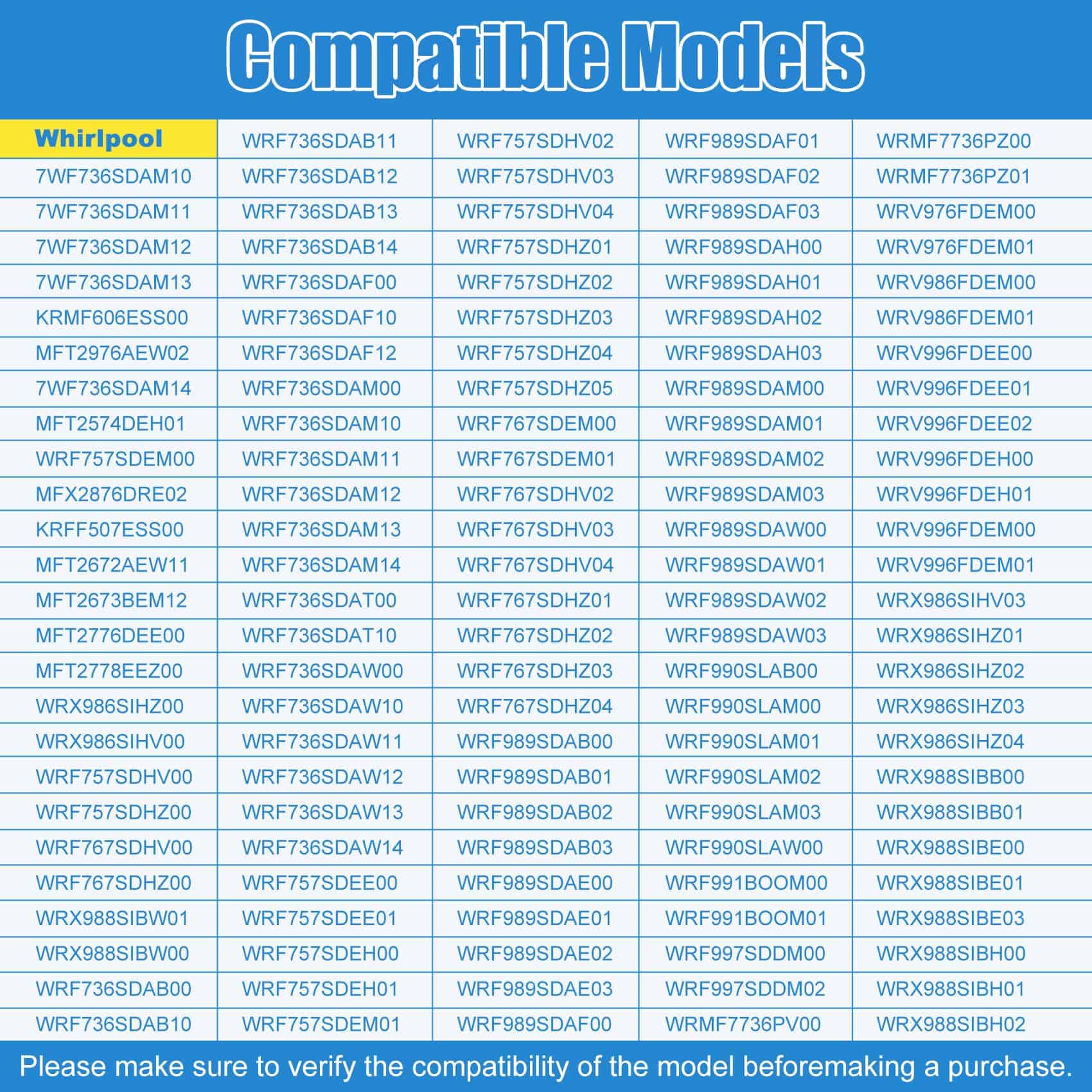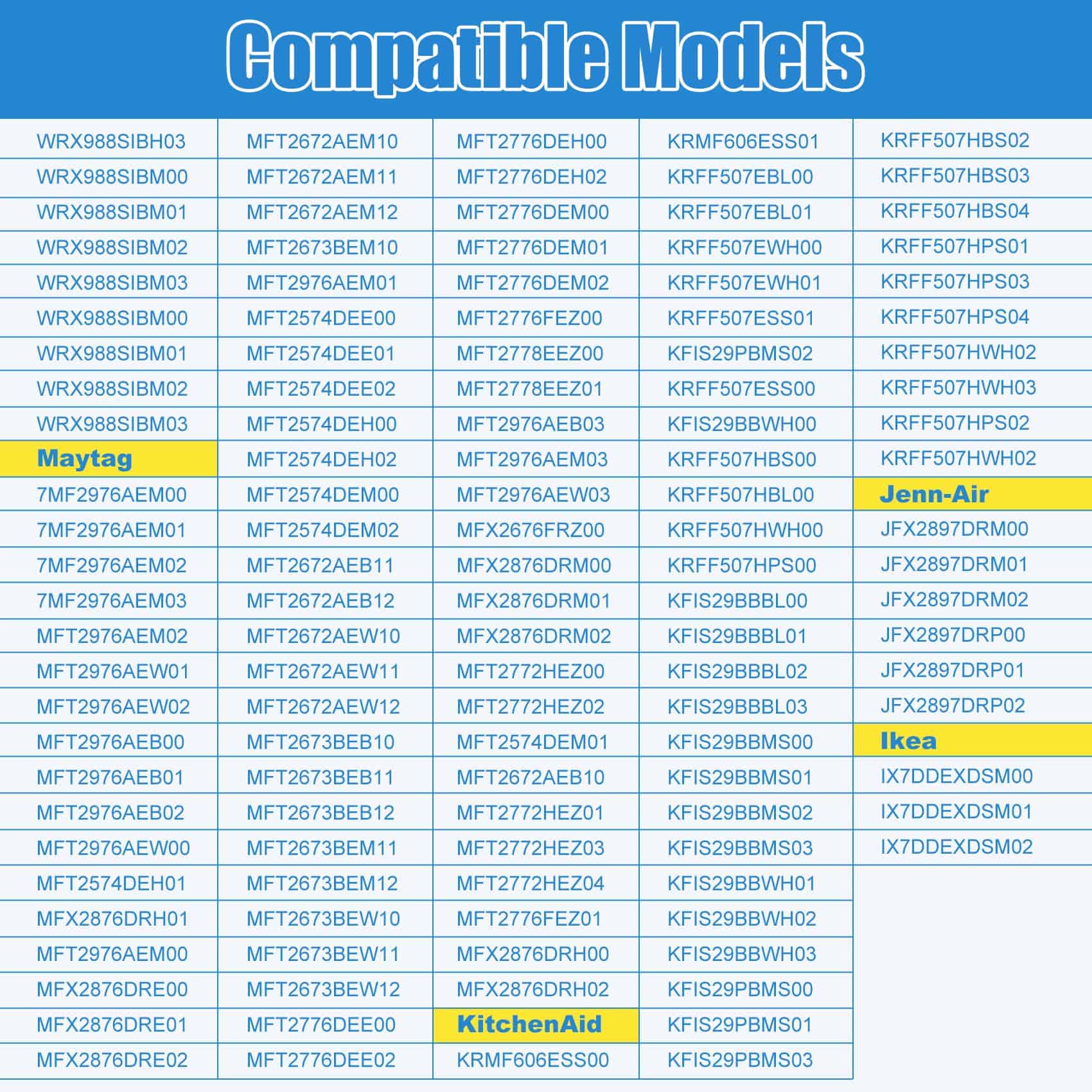 4. Modelos compatibles: Cubo de hielo W10347093/WPW10347093 compatible con los siguientes modelos: Refrigeradores whirlpool, maytag, kitchenAid, jenn-Air, ikea, etc (algunos modelos), Por favor, revisa cuidadosamente antes de comprar. Puedes utilizar la tecla de acceso directo Ctrl+F para buscar si tu modelo de refrigerador coincide. Evita perder tiempo y energía comprando productos inapropiados.