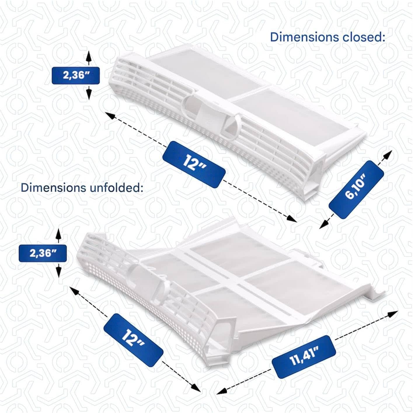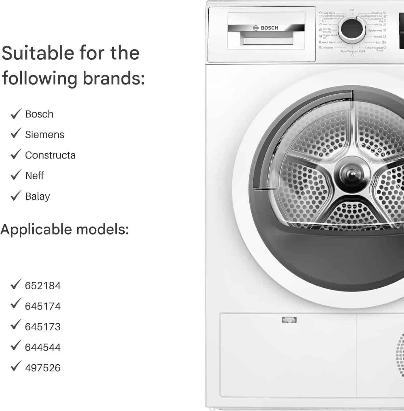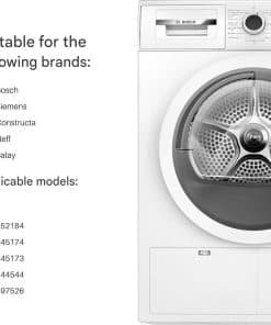 Filtro de pelusa plegable para secadoras de ropa. Compatible con Bosch, Balay, Constructa, Siemens, Neff. Reemplaza los números 00652184, 652184, 00645174, 645174, 00645173, 645173, 00644544, 644544, 00497526, 497526. Dimensiones cerrado: 305 x 155 x 60 mm. Dimensiones abierto: 305 x 290 x 60 mm. Color: Blanco. Material: Plástico. Incluye: 1 x filtro de pelusa. Adecuado para secadoras Bosch Siemens: iQ300 / iQ100 / Avantixx / Classixx / Maxx / Logixx / Exxcel / Extra Class / Series 4 / etc.