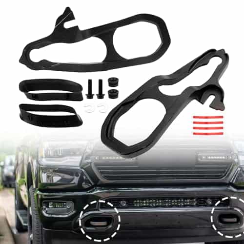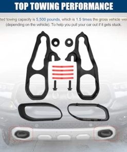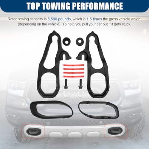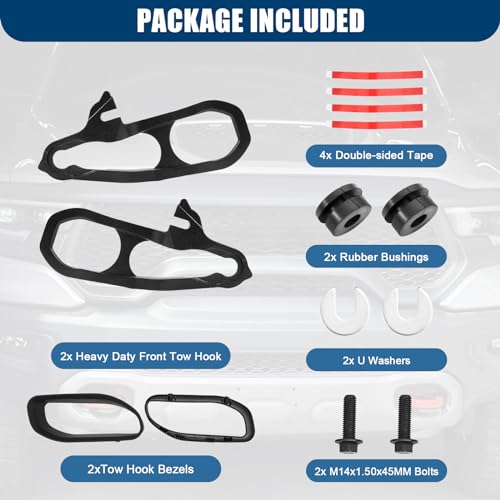 4. INCLUYE PAQUETE 2x Gancho de Remolque Delantero Resistente, 4x Cinta de Doble Cara, 2x Arandelas de Goma, 2x Arandelas en Forma de U, 2x Pernos M14x1.50x45MM, 2x Embellecedores de Gancho de Remolque.