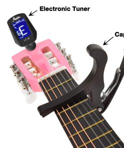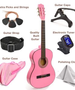 Esta increíble guitarra está hecha de madera de tilo, tanto en la parte superior, inferior y el mástil, que es la madera más popular para las guitarras. Es resistente, robusta y no se verá afectada si se cae, tiene un gran efecto para el sonido. Las cuerdas son mitad acero y mitad nailon, lo cual es la forma correcta de empezar a tocar la guitarra, estas cuerdas están diseñadas para que sea cómodo tocar con los dedos sin lastimar los pequeños dedos de tus hijos. El paquete incluye una correa para sostener la guitarra en tu hombro, un juego extra de cuerdas, púas para tocar con ellas, un estuche bonito para guardar la guitarra, un afinador que te guiará con la afinación correcta y un capo que te dará una gran dirección para las tonadas. Esta guitarra te brindará tonos agradables y reales, podrás tocar cualquier estilo de música que desees sin decepciones, te dará tonos reales y en la parte superior de esta guitarra contarás con 6 afinadores para tus 6 cuerdas donde tendrás la oportunidad de obtener los sonidos que deseas.