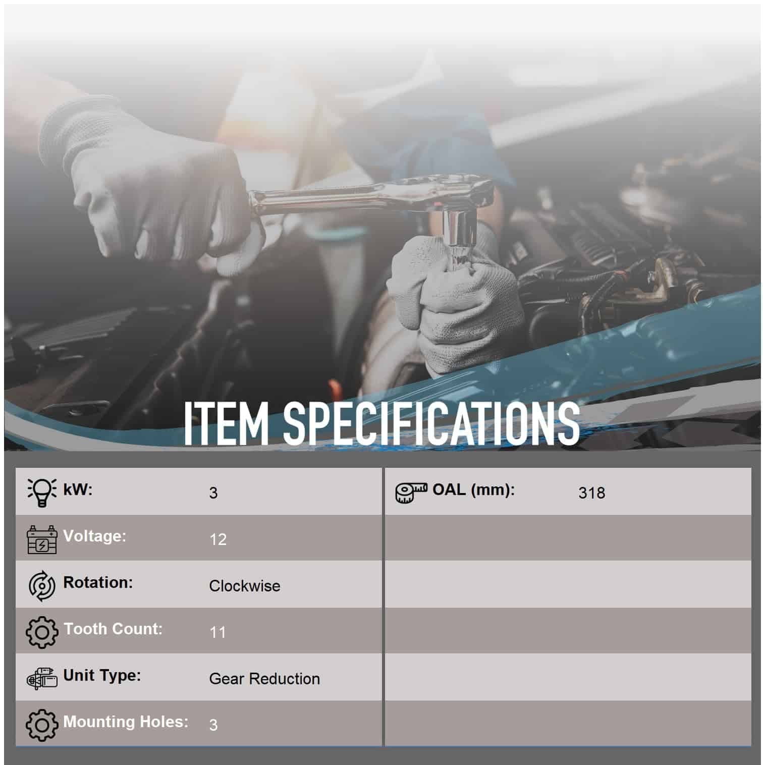 ESPECIFICACIONES: 3.0kW/12 Voltios, CW, Piñón de 11 dientes