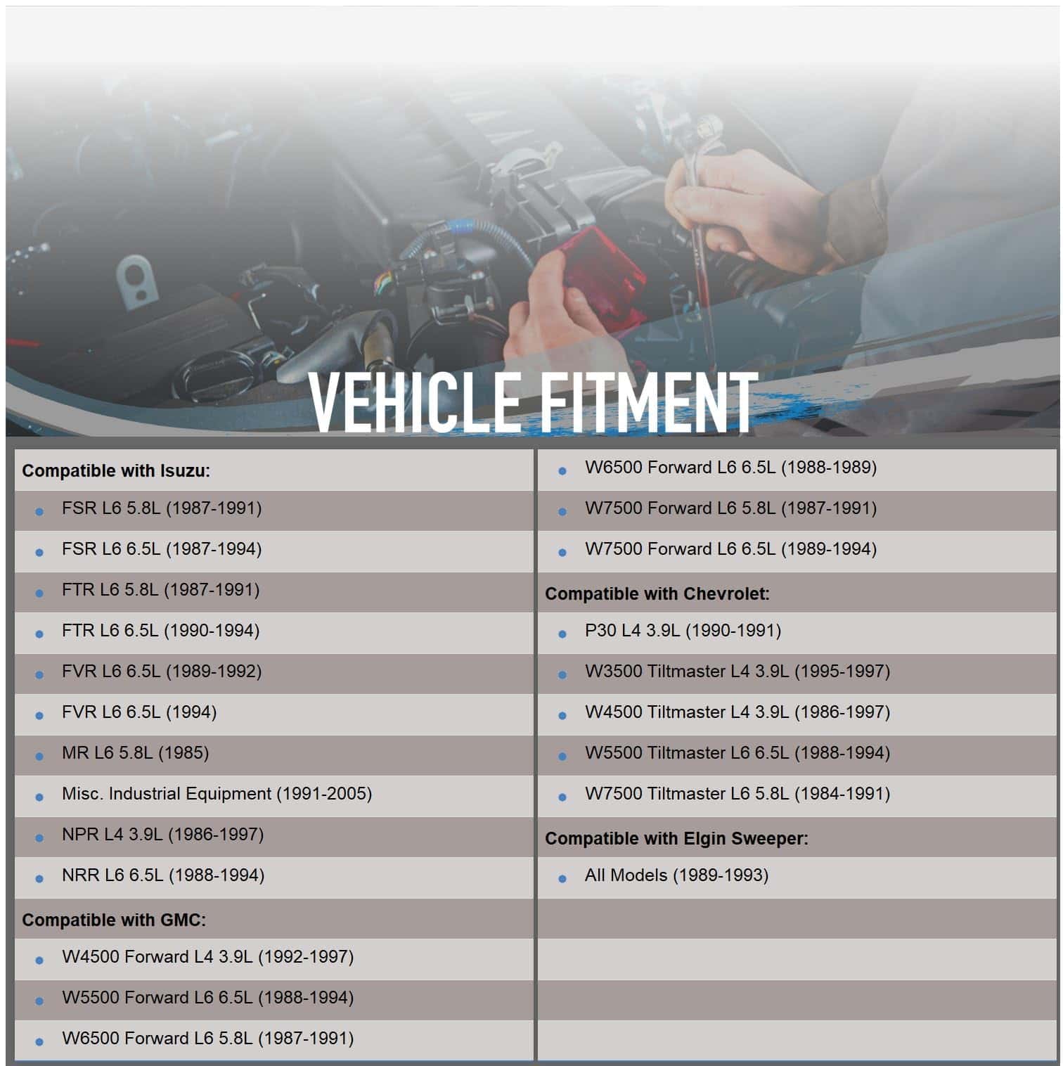 Esta lista es una muestra de todos los autos compatibles para esta pieza. Asegúrese de que este producto se ajuste a su automóvil utilizando el buscador de piezas arriba. REEMPLAZO PARA o COMPATIBLE CON ISUZU: