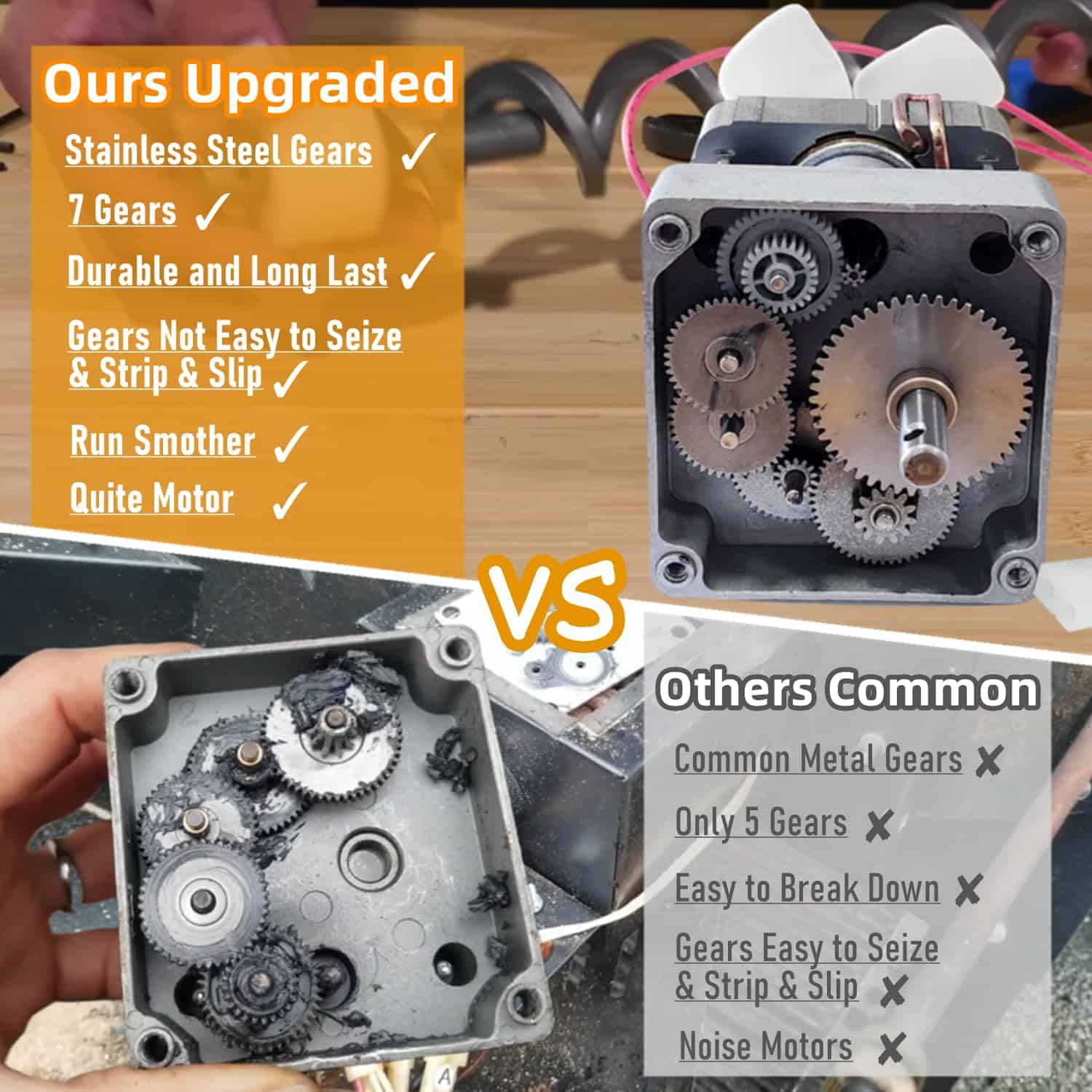 La entrega de pellets será más rápida y eficiente, evitando atascos gracias a los engranajes mejorados. Este motor es compatible con una amplia gama de parrillas de pellets, incluyendo Traeger, Pit Boss, Camp Chef, Z Grills, Oklahoma Joe, Cuisinart WoodCreek y Cabelas. No importa qué modelo tenga, nuestro motor del tornillo sin fin de repuesto se adaptará perfectamente.
