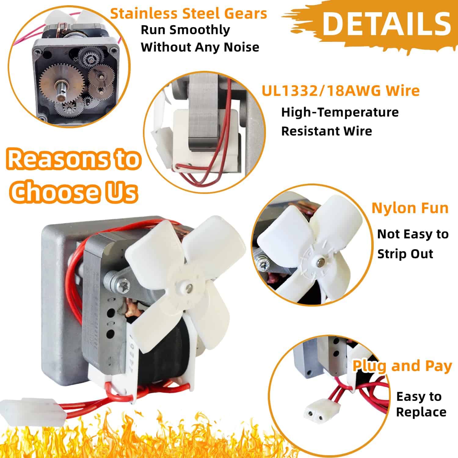 Si su parrilla de pellets está luchando por alcanzar la temperatura adecuada, acelere la entrega de pellets con el nuevo Motor del Tornillo Sin Fin 2.0RPM actualizado. Este motor ofrece más potencia y durabilidad con sus 7 engranajes de acero inoxidable en el interior, que son más resistentes y suaves para asegurar un flujo constante de pellets. La instalación es sencilla, simplemente retire el antiguo motor y reemplácelo con nuestro nuevo motor del tornillo sin fin de 2.0 rpm. Este motor está fabricado con cable de alta temperatura UL1332/18awg Pep, lo que lo hace resistente y duradero para un uso a largo plazo.