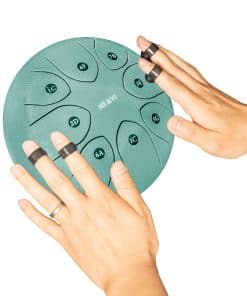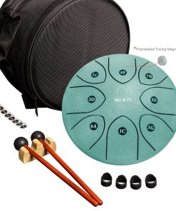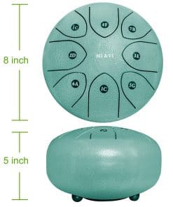 ESPECIFICACIONES: Tipo de Producto: Tambor de Lengua de Acero Forma: Redonda Tamaño: 8 pulgadas Peso: Dimensiones Totales: 8 Diámetro x 5 Altura CONTENIDO DEL PAQUETE: 2x Baquetas de Tambor 1x Bolsa de Tambor de Viaje Pegatinas de Tonos Extra 1x Soporte de Baquetas de Tambor 4x Púas de Dedo Imanes de Afinación: Viene con imán de afinación preinstalado. Forman parte de la característica, que mejora la precisión de la afinación.