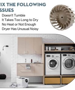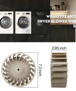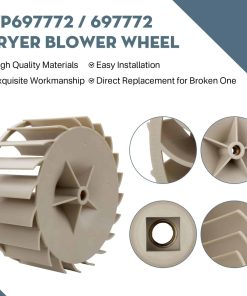 La rueda del ventilador 697772 es compatible con Whirlpool: WGD5605MW0 WGD5605MC0 WGD5620HW0; Amana: NGD5800HW0 NGD5800TQ0 NGD5800DW0; Inglis: IGD7300WW1 IGD7300WW0 IGD7200TW10; Maytag: MGDX500XW0 MGDX500XW1 MGDX500XL0; Kenmore: 11060997990 11062082100 11060952990 11060901990; Crosley: BYCWD6274W2 BYCWD6274W1; KitchenAid: KGHS02RWH2 KGHS02RMT0