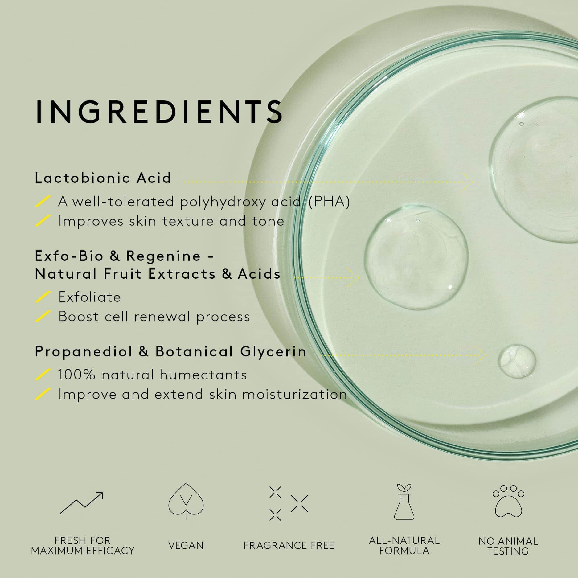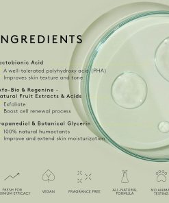 3. CÓMO FUNCIONA: Este tónico ácido suave y totalmente natural exfolia e hidrata la piel para obtener un brillo saludable. Libre de fragancias. Sin alcohol.