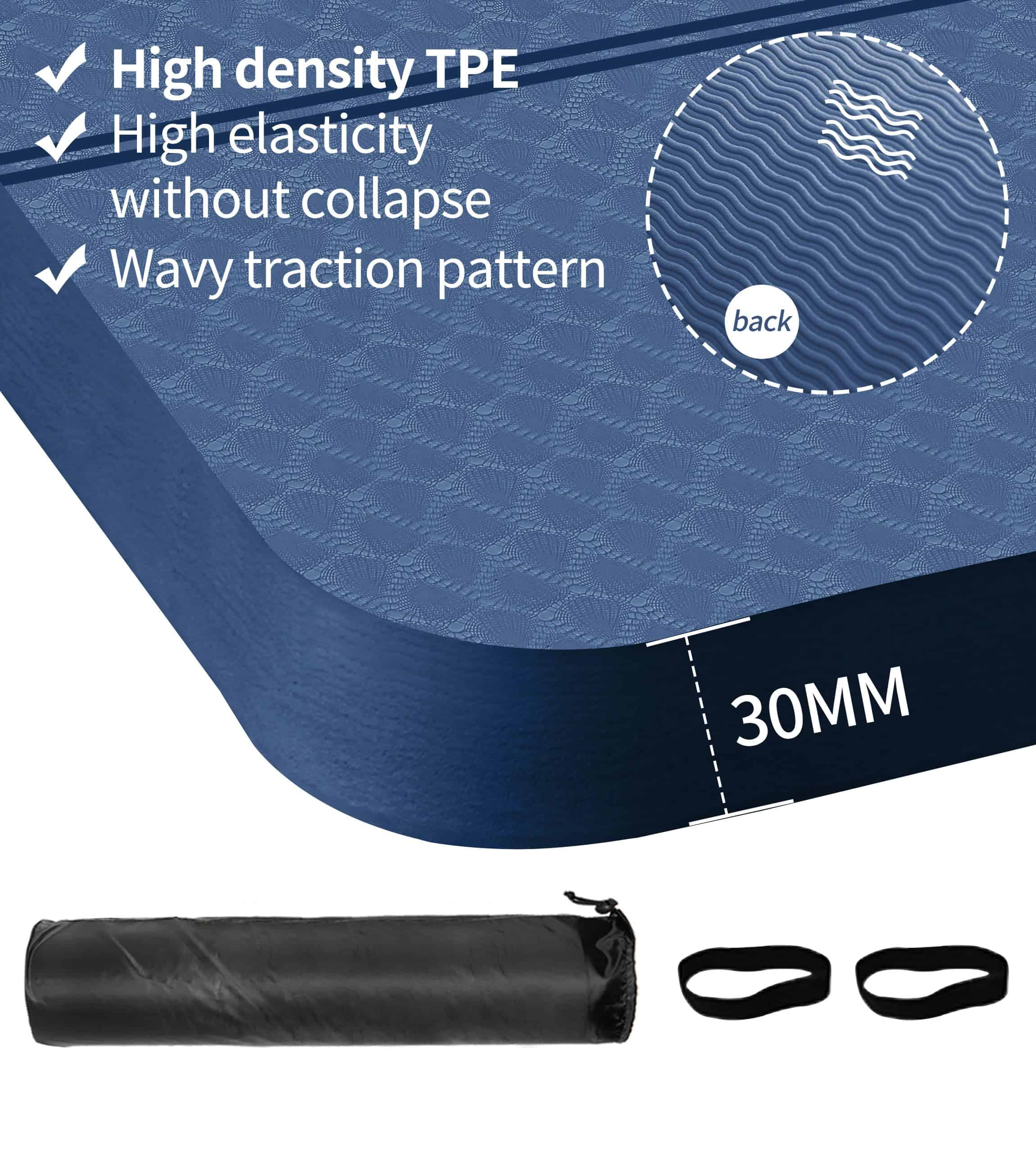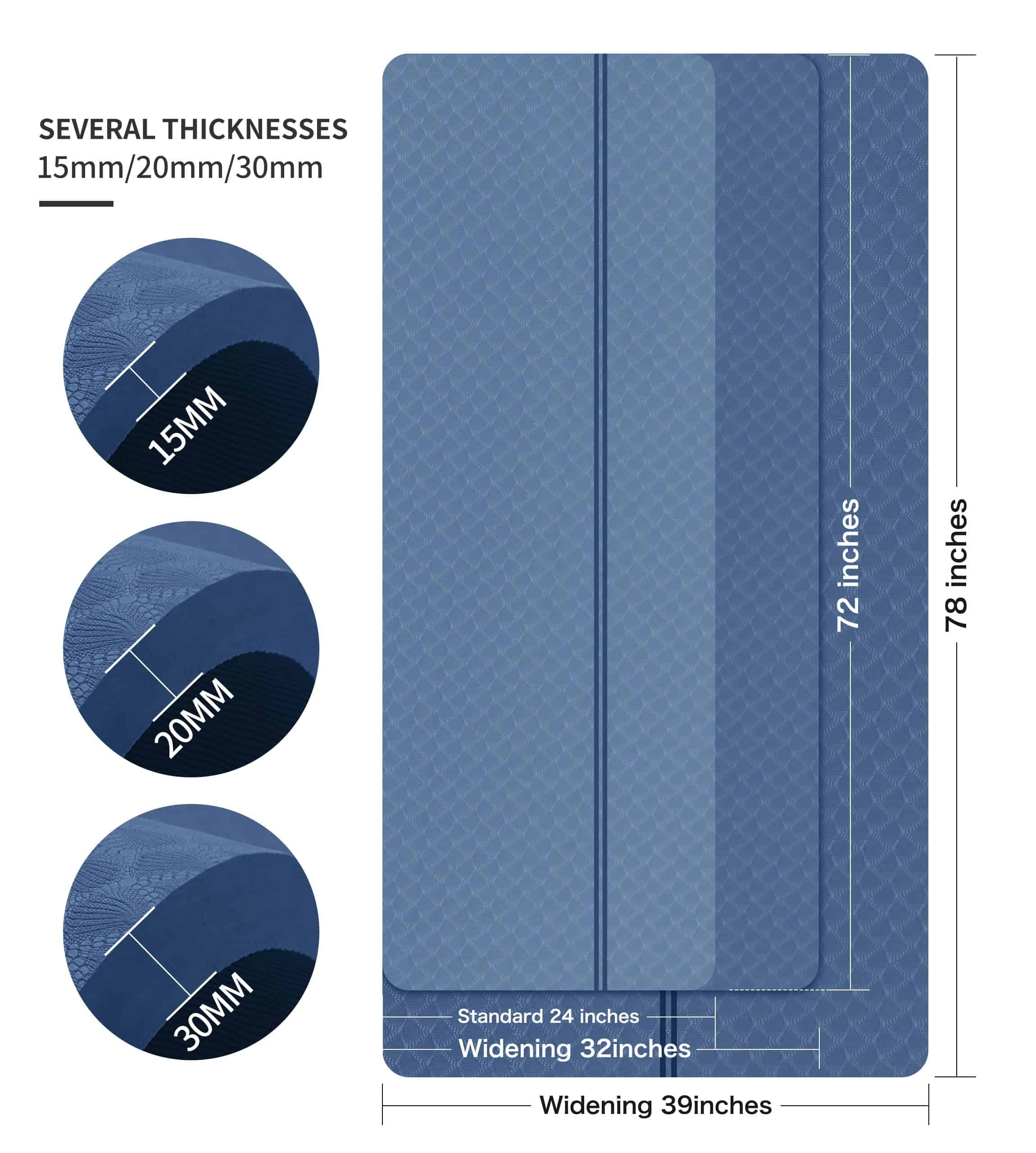 4. EXTRA LARGO Y EXTRA ANCHO: El 72″x32″/78″x36″ de nuveti ofrece un espacio adecuado para cualquier tipo de ejercicio como yoga, pilates, bikram, y ejercicios de fitness. La mayoría de los tapetes de yoga en el mercado tienen 6mm, 8mm o incluso menos de grosor. Este tapete de yoga se ha engrosado a 15mm, 20mm, 30mm, lo que puede proporcionar más soporte y protección para tus tobillos, rodillas, articulaciones y cuerpo en suelos duros, así como absorber vibraciones y reducir el ruido.
