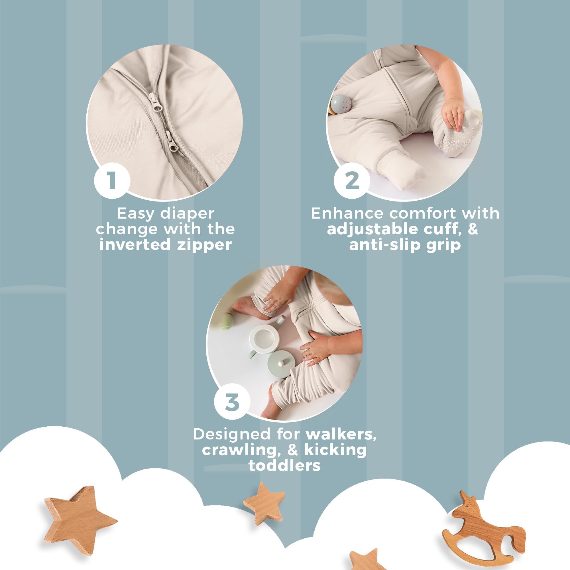 Nuestro producto fue diseñado por mamás para mamás. Durante mucho tiempo, hemos sido usuarias de muchas bolsas de dormir diferentes. Queríamos proporcionar una solución para bebés y niños pequeños que se quedan dormidos en el coche/carrito/portabebé. Nuestra misión es asegurarnos de que estén bien cubiertos y proporcionar una transición fácil a sus camas. No más intentos de cubrir con una manta que caerá en algún momento. Puede estar seguro de que su bebé estará cubierto con la bolsa de dormir más suave, segura y de mayor calidad que hay. Escogimos conscientemente esta tela específica de 1.0 TOG 100% transpirable entre otras 100 para asegurarnos de que sea totalmente lavable a máquina, le durará años (y esperamos que más bebés) y mantendrá a su bebé a la temperatura adecuada durante las 4 estaciones. El diseño de pies separados ayudará a nuestros pequeños caminantes a moverse mejor sin tropezar y para nosotros, los padres, la capacidad de sostenerlos fuerte y seguros en nuestros brazos. ¡Desde arriba hasta abajo pensamos en todo! Nuestros puños diseñados de manera única le darán la capacidad de ajustarlos según sea necesario sin necesidad de mover o despertar a sus bebés. ¡Inténtelo!