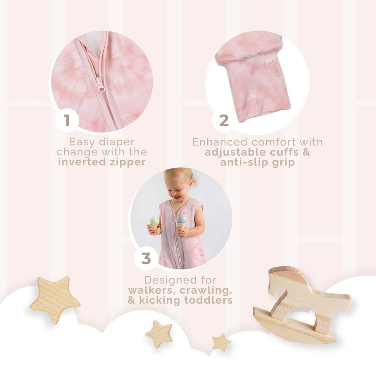 Nuestro producto fue diseñado por mamás para mamás. Durante mucho tiempo, hemos sido usuarias de diferentes sacos de dormir. Queríamos ofrecer una solución para bebés y niños pequeños que se quedan dormidos en el coche/carrito/portador. Nuestra misión es asegurarnos de que estén bien cubiertos y facilitar la transición a sus camas. No más intentos de cubrirse con una manta que se caerá en algún momento. Puede estar seguro de que su bebé estará cubierto con el saco de dormir más suave, seguro y de mayor calidad que existe. Elegimos conscientemente este tejido específico de 100% transpirable con un TOG de 1.0 entre otros 100 para asegurarnos de que sea completamente lavable a máquina, le durará años (y ojalá más bebés) y mantendrá a su bebé a la temperatura adecuada durante las 4 estaciones. El diseño de pies separados ayudará a nuestros primeros caminantes a moverse mejor sin tropezar y para nosotros, los padres, la posibilidad de sostenerlos firmemente y con seguridad en nuestros brazos. ¡De principio a fin, pensamos en todo! Nuestros puños diseñados de manera única le darán la capacidad de ajustarlos según sea necesario sin la necesidad de mover o despertar a sus bebés. ¡Pruébelo!