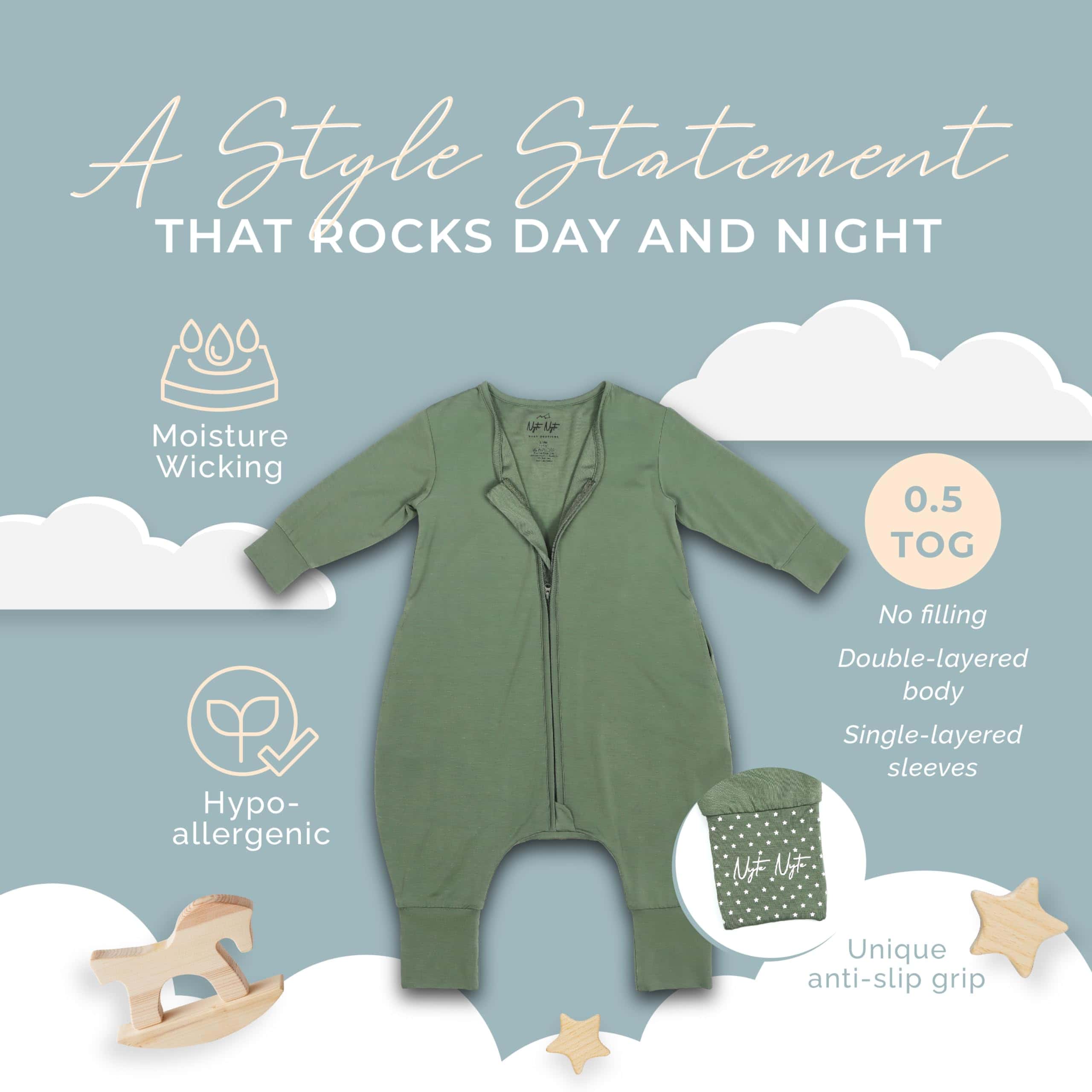 1. Asegure la comodidad de su bebé mientras duerme – ¡Adiós a los pies fríos! Con el Saco de Dormir SnuggleSack de Nyte Nyte Baby, su pequeño puede dormir tranquilamente. Nuestro saco de dormir tiene mangas largas y un diseño anti-patadas que mantiene a su bebé abrigado y acogedor toda la noche. 2. Saco de dormir para bebés suave al tacto – Diseñado con una tela imprescindible para bebés que es acogedora y termorreguladora. Estas características permiten que cada saco de dormir ayude a mantener la temperatura corporal ideal de su bebé. 3. Apto para todas las estaciones – Nuestro saco de dormir transpirable para recién nacidos y niños pequeños es adecuado para todo tipo de clima. Para mantener los pies de su pequeño calientes durante las noches más frías, simplemente doble los puños del saco de dormir. Durante los días más cálidos, simplemente dóblelos para que los pies de su bebé respiren. 4. Saco de dormir fácil de usar para niños pequeños – Nuestros sacos de dormir para verano y otras estaciones protegen la piel delicada de su bebé. Con una cremallera bien cubierta invertida, cada saco de dormir para bebé/niño pequeño se puede abrir desde la parte superior o inferior fácilmente, lo que le permite cambiar el pañal de su bebé sin problemas. 5. Saco de dormir versátil con pies – Nuestro saco de dormir con piernas separadas proporciona máxima comodidad y seguridad mientras sostiene a su bebé. Puede usarlo como saco de dormir para caminantes, asientos de coche, cochecitos, portabebés e incluso como pijama o ropa de día. Cada saco de dormir que hacemos para bebés de 6 a 12 meses tiene una característica antideslizante, que les permite correr de manera segura sin tropezar.