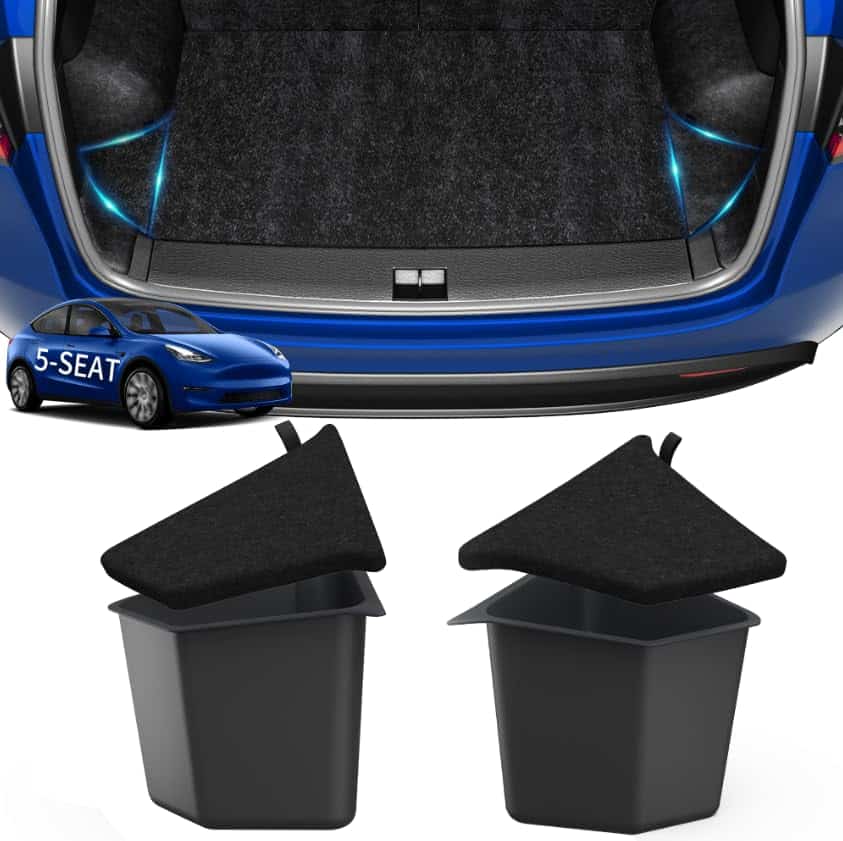 3. MALETERO COMPLETO DEL MODELO Y: Las cajas de almacenamiento de maletero perfectamente combinadas completan su modelo y; Las tapas de moqueta a juego amplían el espacio en el área de carga y evitan que los artículos se deslicen por los surcos profundos; El diseño ingenioso hace que su carro esté más limpio y organizado.