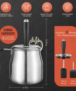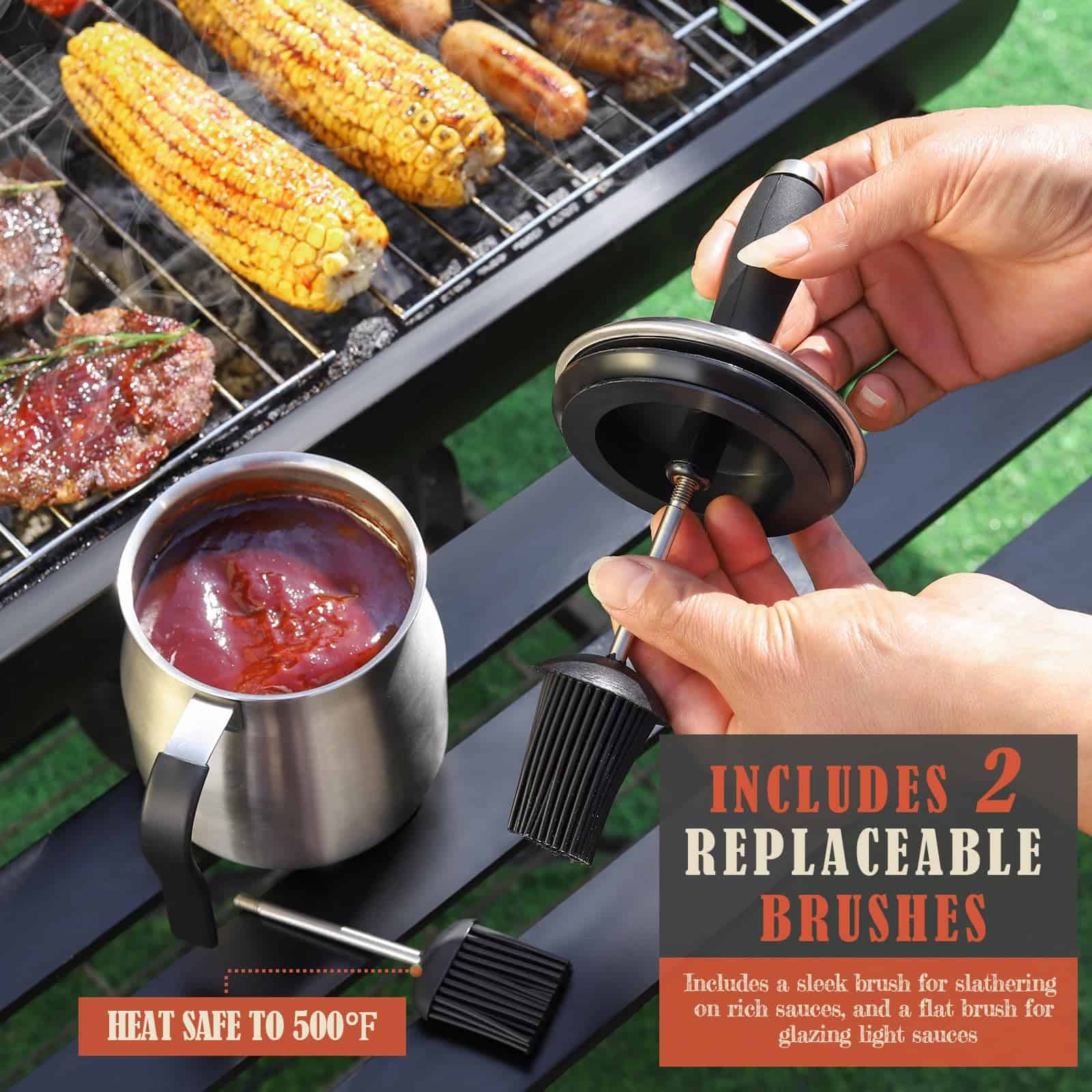Set incluye olla para salsa y 2 pinceles reemplazables. Un pincel elegante para untar salsas ricas y un pincel plano para glasear con salsas ligeras, vinagretas o mantequilla derretida. Este set es la respuesta para un fácil bañado mientras se cocina en interiores o exteriores.
