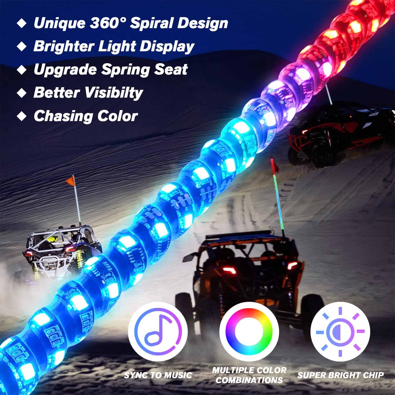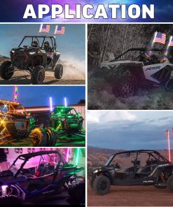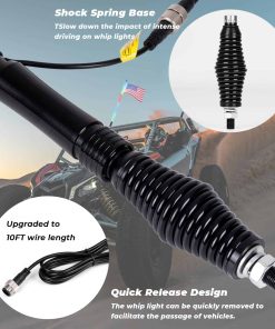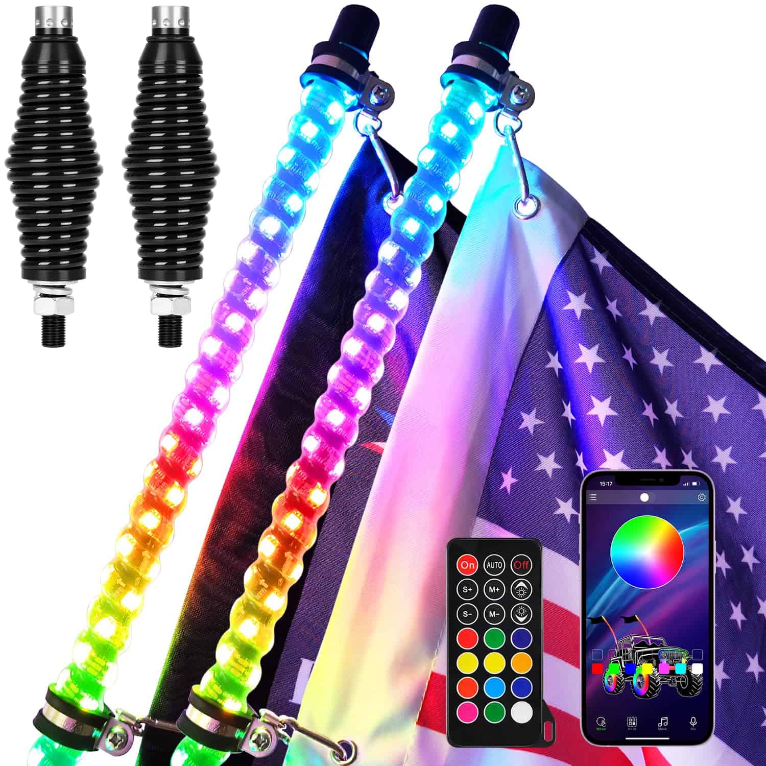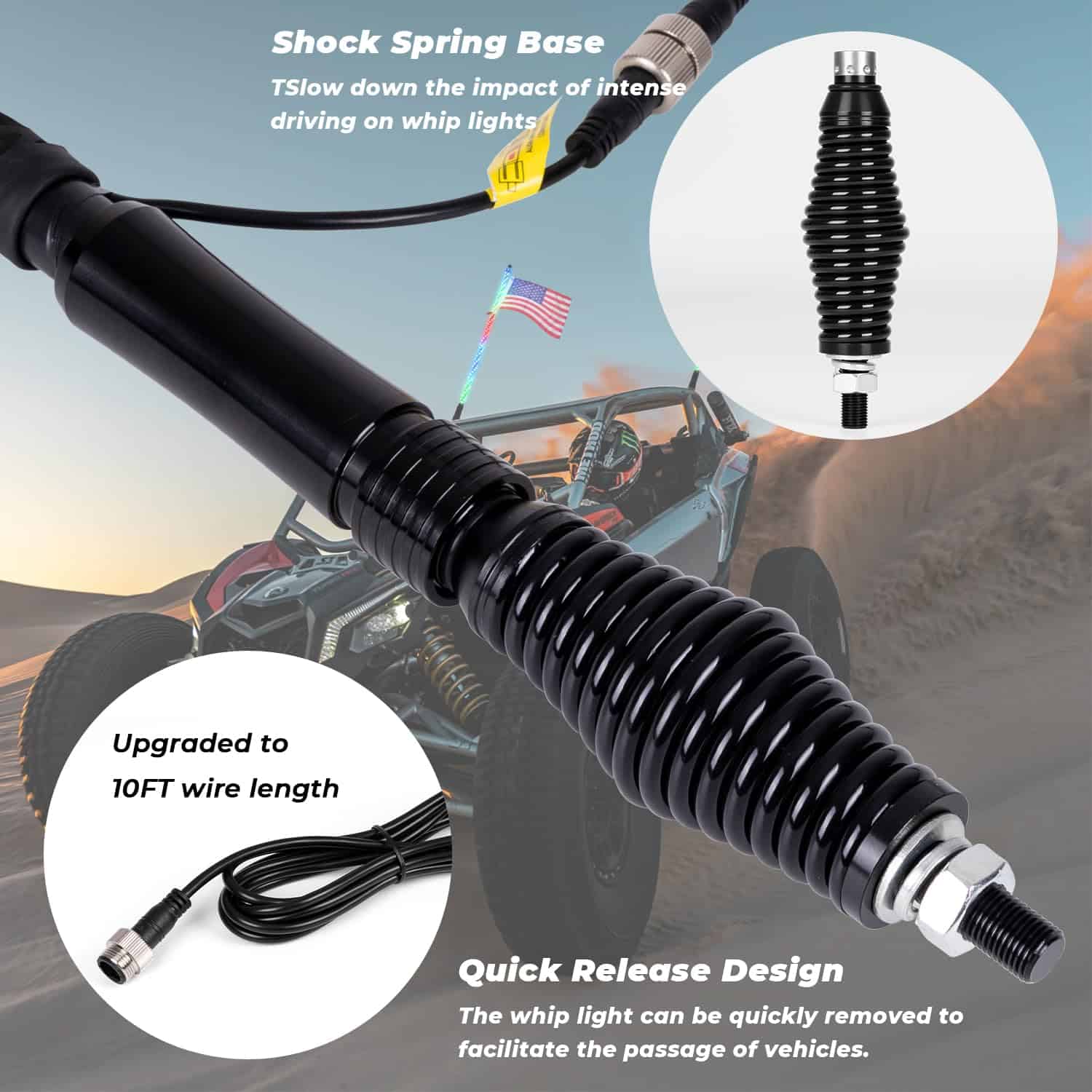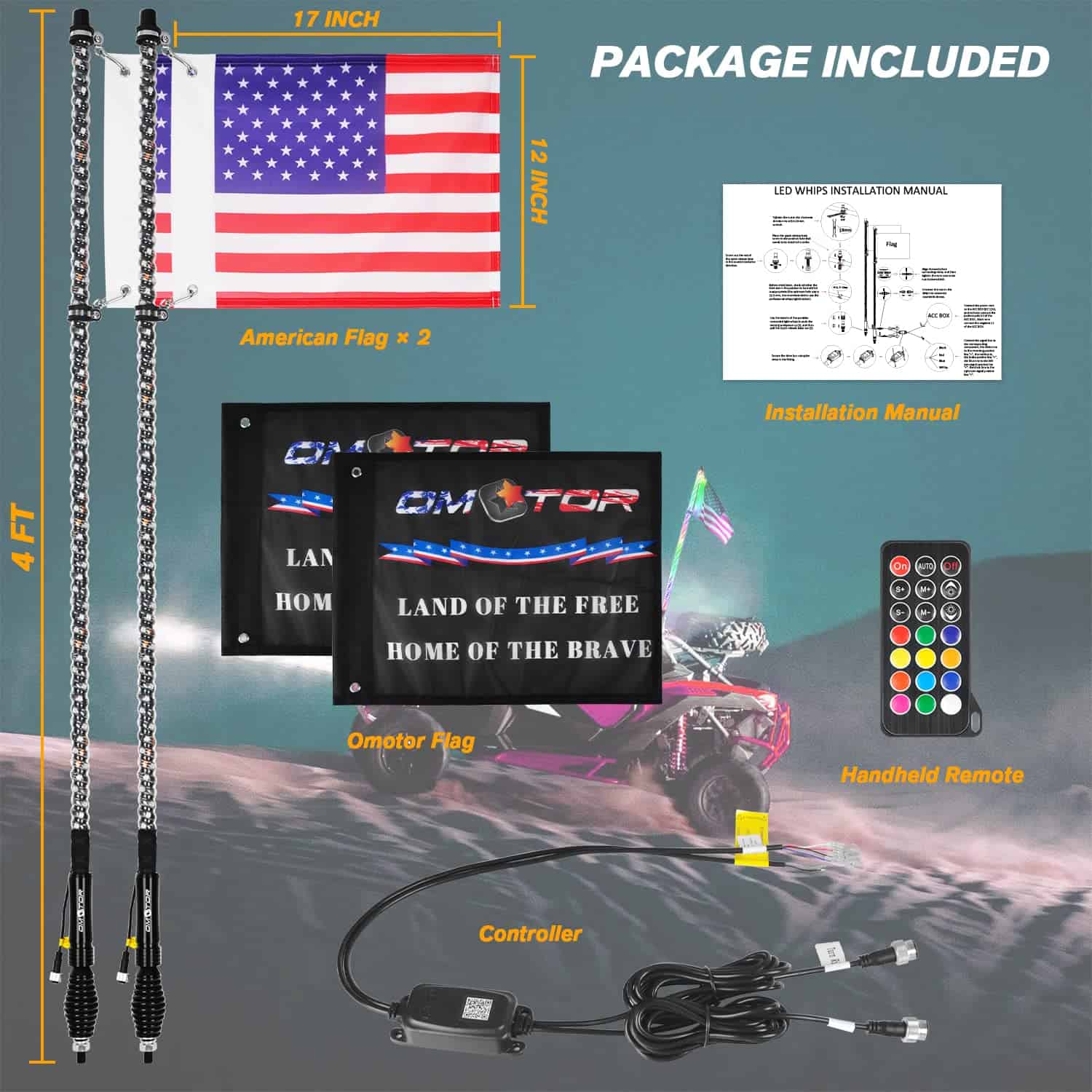 CAJA INCLUYE – 2 piezas de 3FT LED Whips, arnés y caja de control plug-n-play, control remoto, base de montaje de conexión/desconexión rápida, bandera estadounidense con anillos de mosquetón, manual de instrucciones.