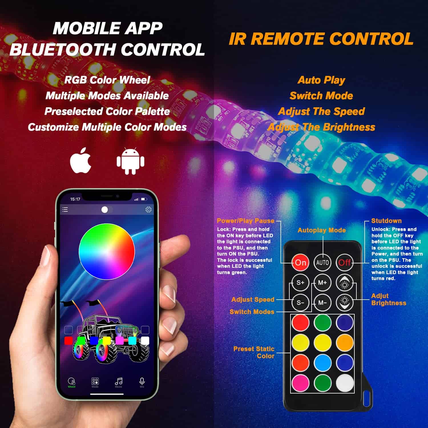 OVERVIEW – Hay dos métodos de control remoto: Bluetooth APP y control remoto. El Control Remoto RF ofrece 300 patrones, 366 modos, 32 niveles de brillo y 10 configuraciones de velocidad para efectos de luces de rastreo, intermitentes e incluso secuenciales.