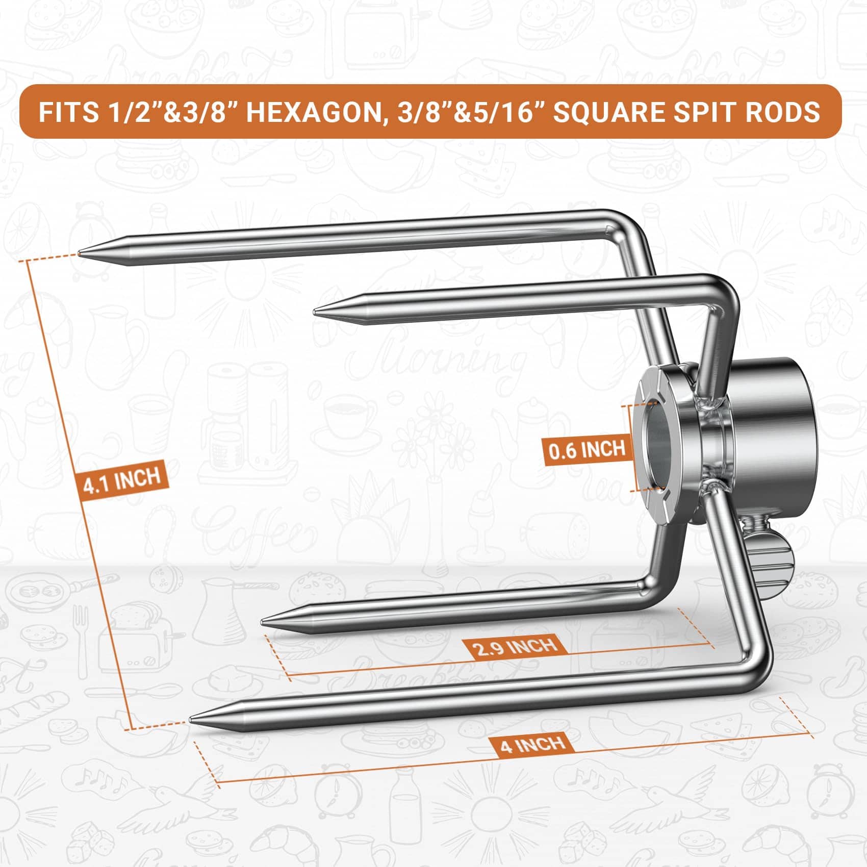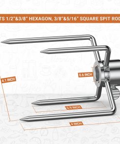 Los tenedores de carne de asador de parrilla Onlyfire 6003 (1 par) de repuesto encajan en varillas de asador hexagonales de 1/2 pulgada y cuadradas de 3/8 pulgadas y 5/16 pulgadas. Estos tenedores de asador están diseñados con cuatro púas desplazadas para una mayor capacidad. Son de excelente calidad y definitivamente substanciales. Las púas cónicas permiten una fácil inserción y extracción, y el ajuste fácil de tornillo de pulgar para ajustes rápidos. Se recomienda medir el tamaño de sus piezas originales y comparar con las de repuesto ANTES de ordenar.