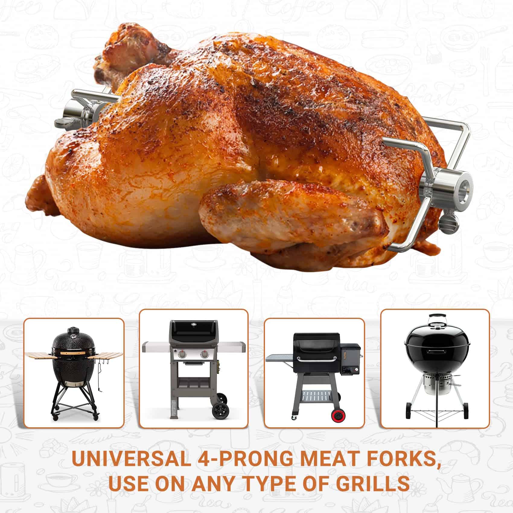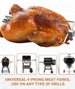 Estos tenedores para asar a la parrilla de marca Onlyfire son ideales para su parrilla rotisserie. Con un diseño de cuatro púas compensado, brindan una capacidad adicional para asar a la parrilla todo tipo de carne. Fabricados en acero inoxidable de alta calidad, estos tenedores son duraderos y resistentes. Las púas cónicas permiten una inserción y extracción fácil, mientras que el ajuste rápido con tornillo de pulgar facilita los ajustes necesarios. Asegúrese de medir el tamaño de sus piezas originales y compararlos con los reemplazos antes de realizar su pedido para garantizar una compatibilidad perfecta. Disfrute de asar a la parrilla con estos tenedores de alta calidad.
