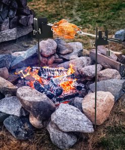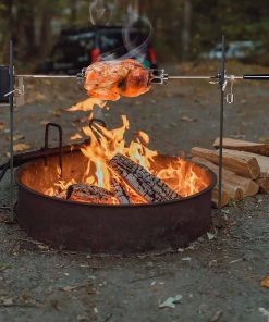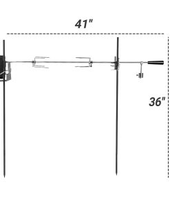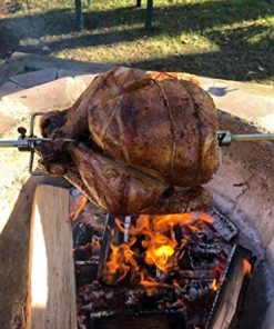 onlyfire Barbecue Rotating Cordless Dual Post Open Fire Spit Rotisserie Grill System with 38 Inch Spit Rod es la solución perfecta para cocinar a la parrilla en una fogata cuando no hay electricidad disponible. Este sistema de parrilla rotativa de acero duradero detiene en 2 posiciones para un sabor delicioso y lento asado. El sólido sistema de soporte de poste doble de acero permite una configuración fácil y resistente. Un simple tornillo ajusta la altura de la parrilla y la parrilla. Incluye rodillo, cuatro tenedores de carne de cuatro dientes, varilla de espiga hexagonal de 38 � 3/8», motor de batería inalámbrico de 3V DC, soporte y brazos de acero ajustables en altura. Todo construcción de acero. Capacidad de hasta 20 libras. Fácil montaje y desmontaje sin herramientas. Se recomienda una limpieza rápida después del uso, ya que es difícil de limpiar después de que se enfríe completamente.