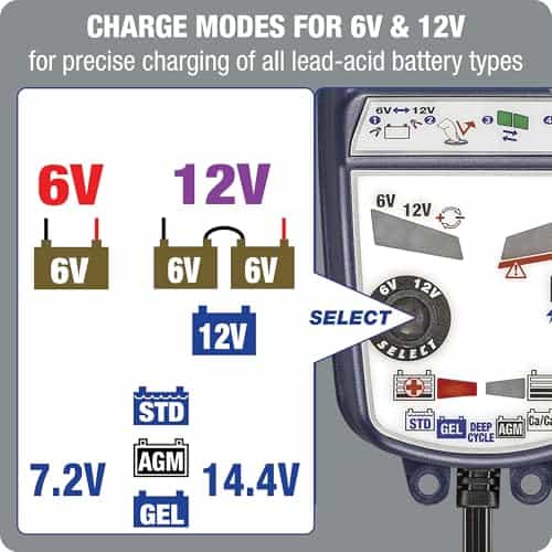 2. Selecciona el voltaje de carga correcto para tus baterías de 6V o 12V inundadas, selladas AGM y GEL o de plomo-calcio CA-CA.