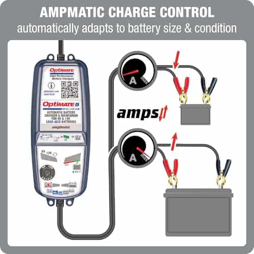 4. La carga es completamente automática y sin preocupaciones. El control de carga Ampmatic con compensación de temperatura incorporada ajusta automáticamente la velocidad de carga según el tamaño y la condición de la batería y la temperatura ambiente, garantizando una carga óptima en todo momento.