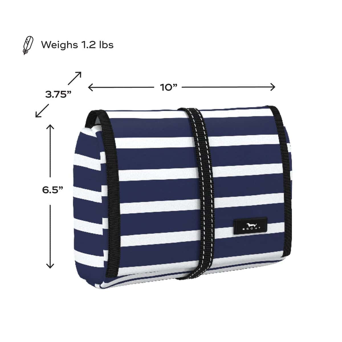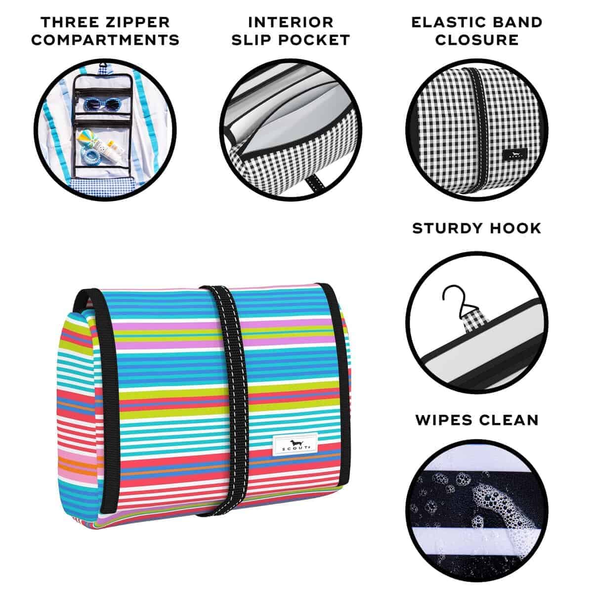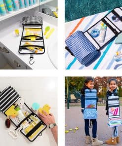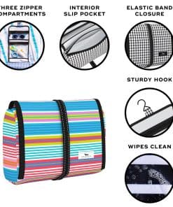 5. CUÉLGALO O COLOCALO: tu elección. Usa el gancho resistente para colgarlo cuando esté abierto, luego enrolla la bolsa (como un burrito) cuando el gancho no esté en uso. El cierre con banda elástica mantiene todos tus accesorios de baño organizados en tu equipaje, bolso de mano o bolso de noche.