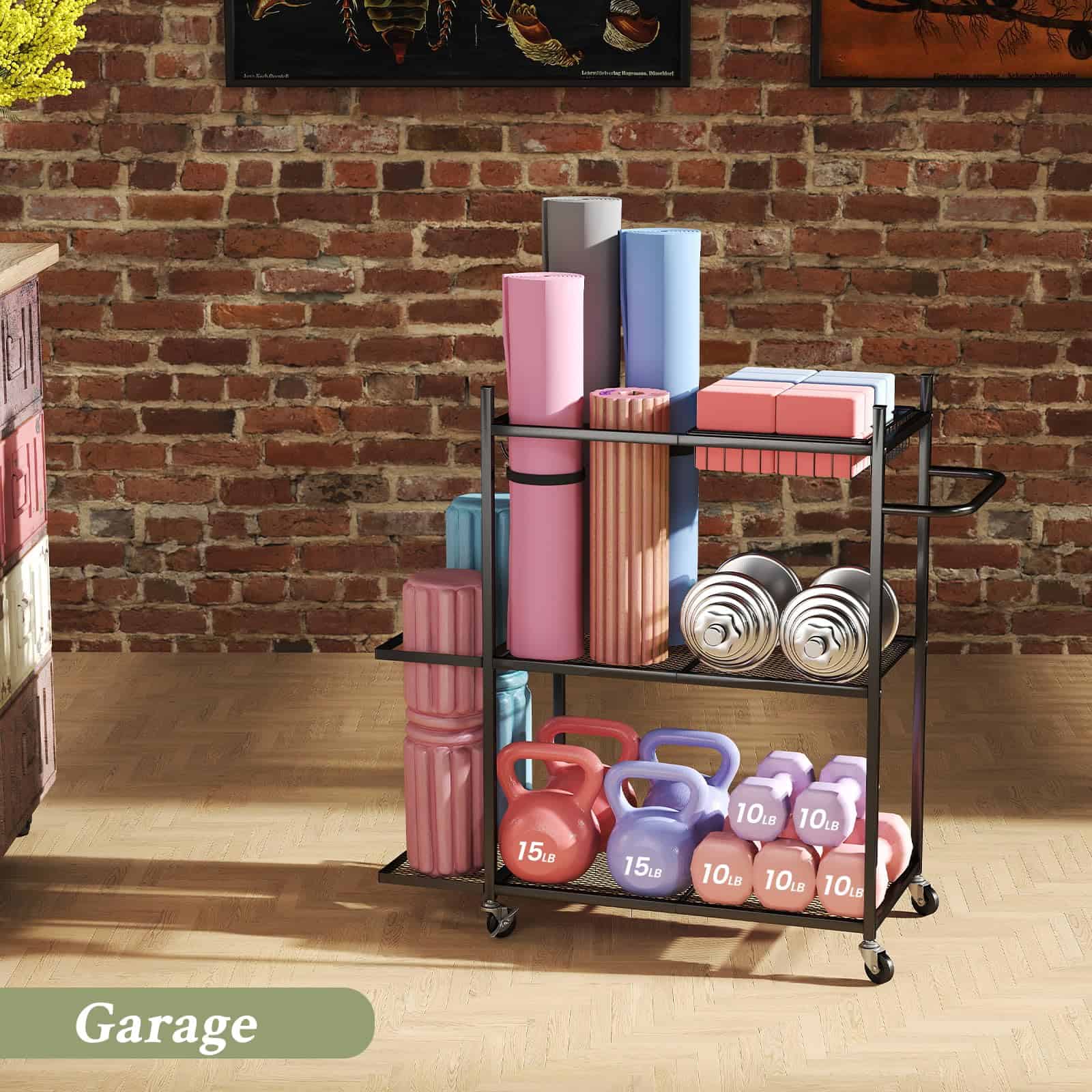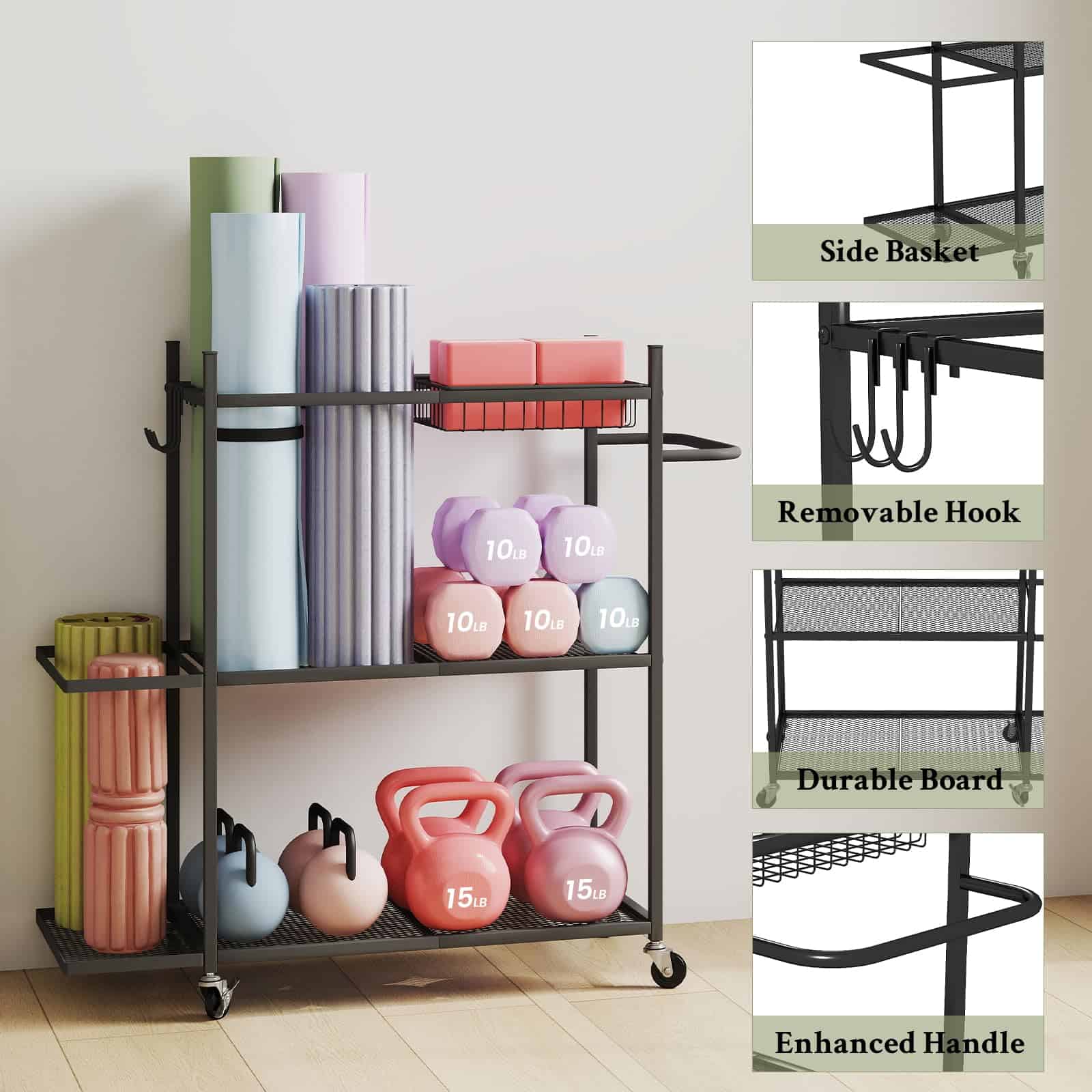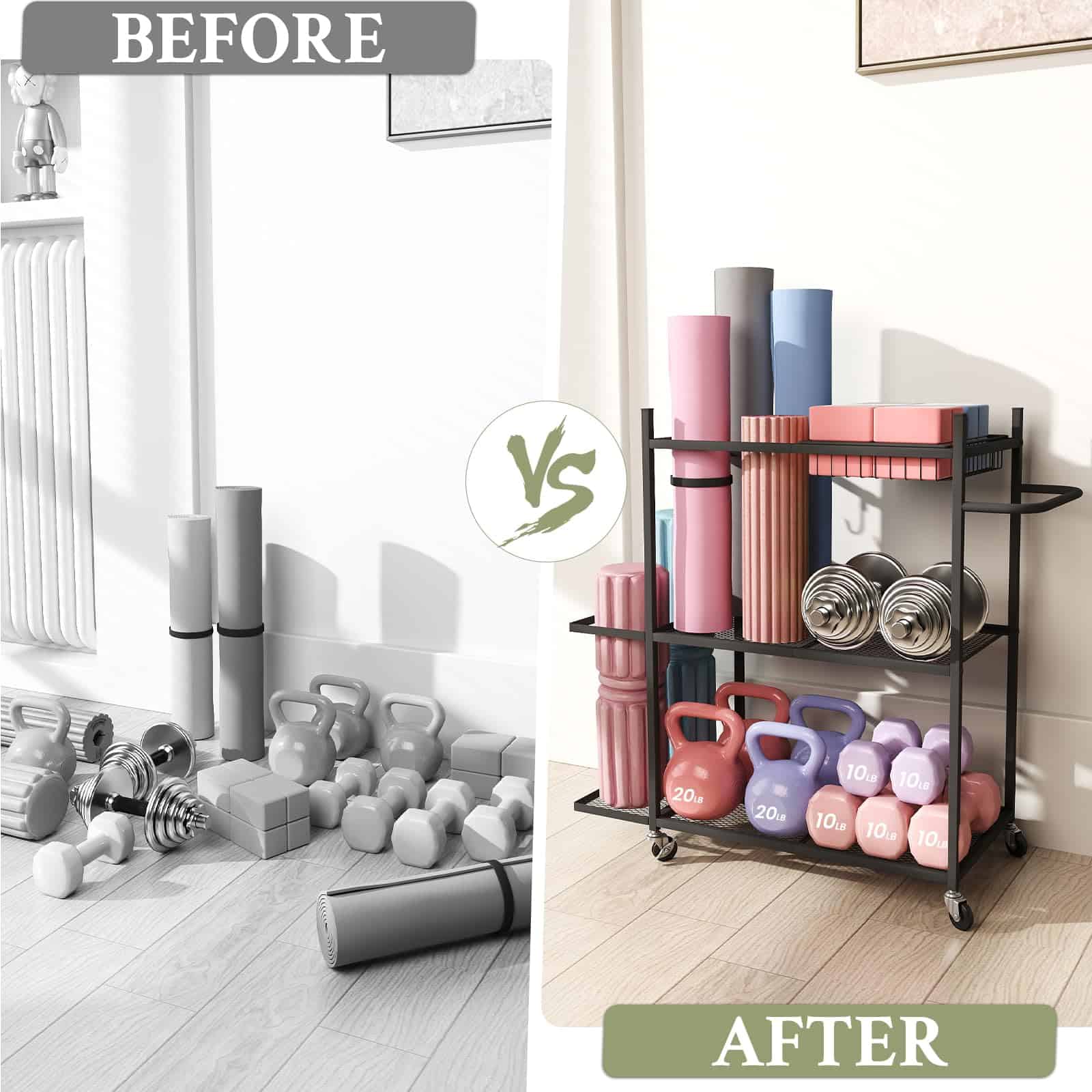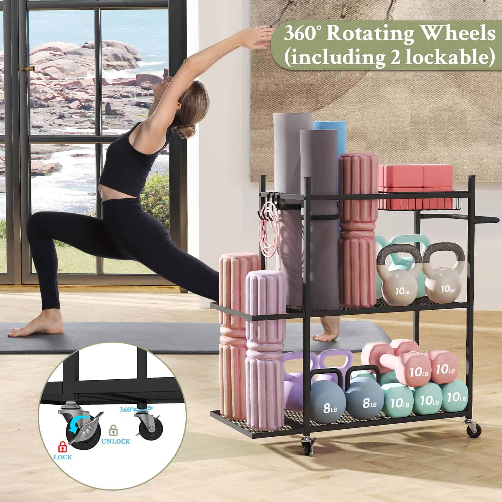 1. Elegante y Moderno: El rack de almacenamiento de colchonetas de yoga está equipado con 2 niveles de malla de metal, una cesta montada en el lateral, asas ergonómicas, 3 ganchos ajustables y 1 cesta removible. El diseño abierto hace que sea fácil agarrar y llevar, por lo que puedes rápidamente tomar lo que necesitas para tu entrenamiento sin perder tiempo buscando el equipo.
