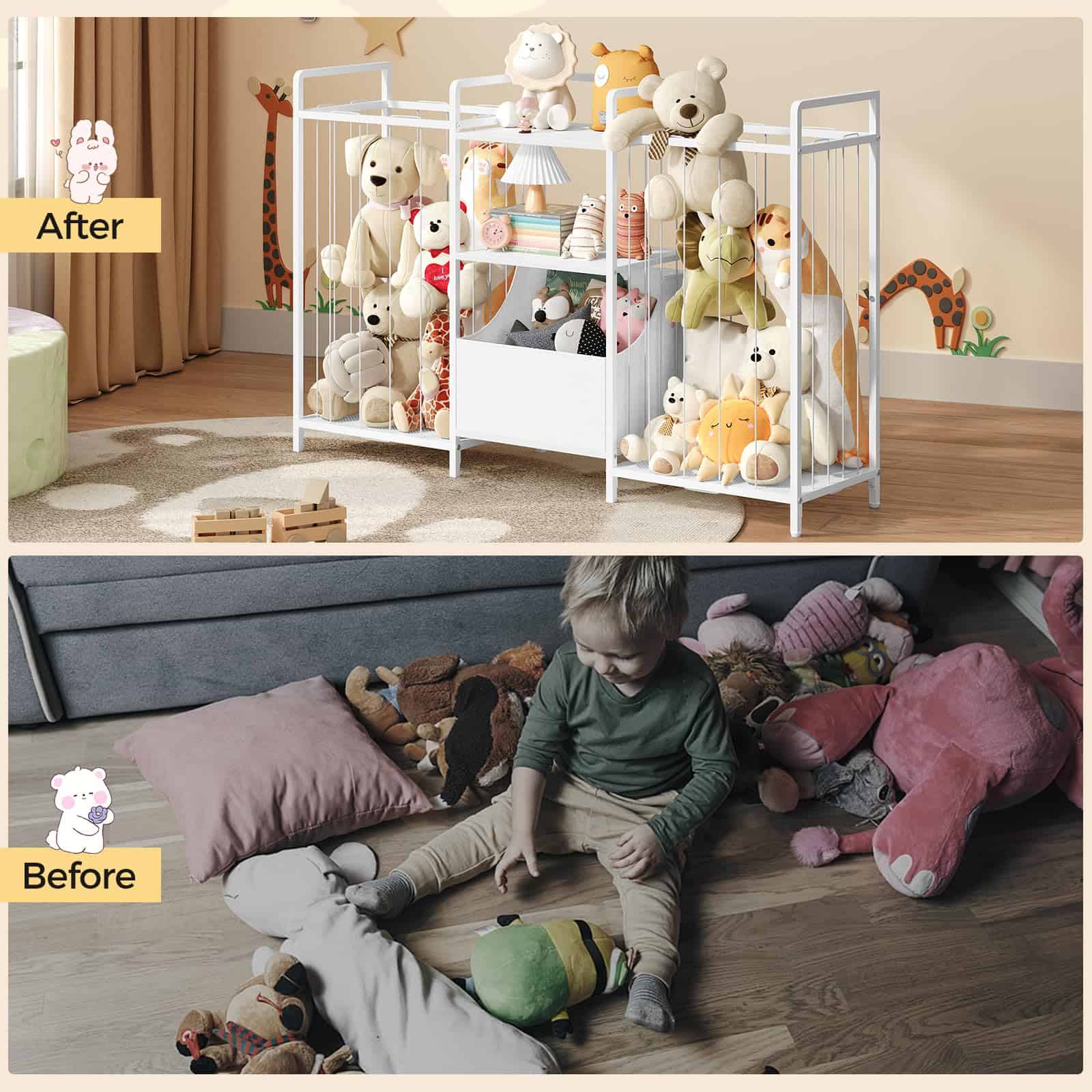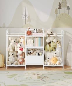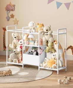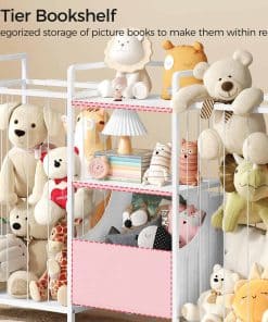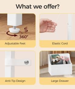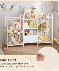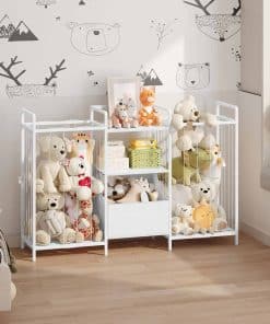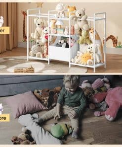 This is a detailed long description of the product with all its features and benefits highlighted. It talks about the high-quality metal frame with adjustable feet and anti-tip devices, the spacious space provided for organizing toys, the flexible and moveable drawers for easy toy collection, the stylish and versatile design that seamlessly integrates into any home decor, and the easy assembly process with illustrated instructions. It emphasizes the importance of child safety, independence, and organizational skills that the toy storage shelf promotes. Overall, it showcases the product as a must-have for any kid’s room, playroom, nursery, or living space